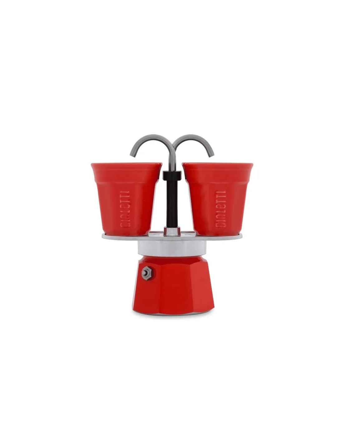 Innowacyjny i nietypowy moka pot Bialetti Mini Express przygotuje 2 filiżanki kawy jednocześnie. W przeciwieństwie do klasycznych moka pots, kawa przepływa bezpośrednio do przygotowanych czerwonych filiżanek.
