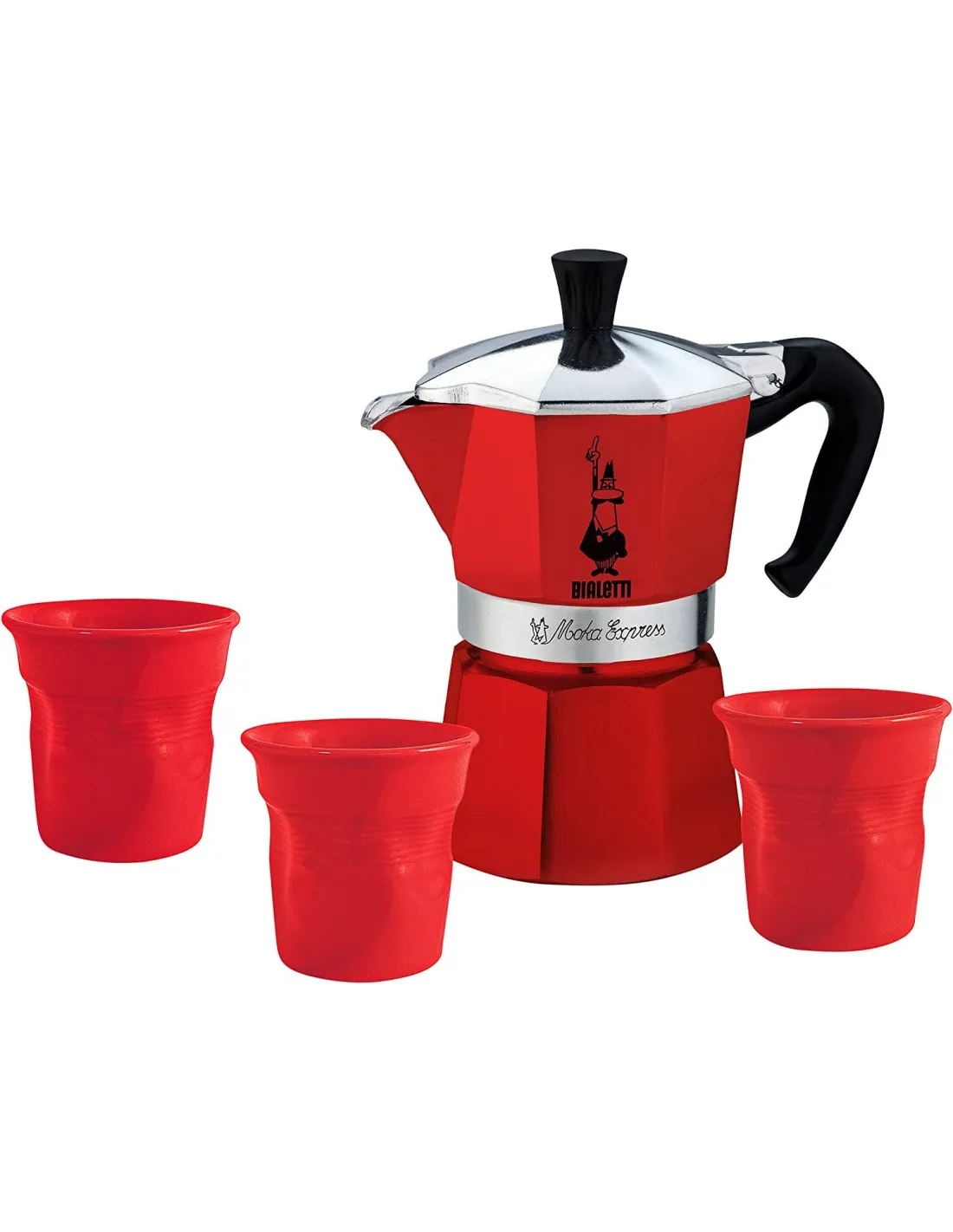 Legendarna kawiarka Moka Express włoskiej firmy Bialetti do tradycyjnego przygotowywania mocniejszej kawy. Opakowanie prezentowe z trzema filiżankami. Kolor: czerwony. Pojemność: 130 mm.