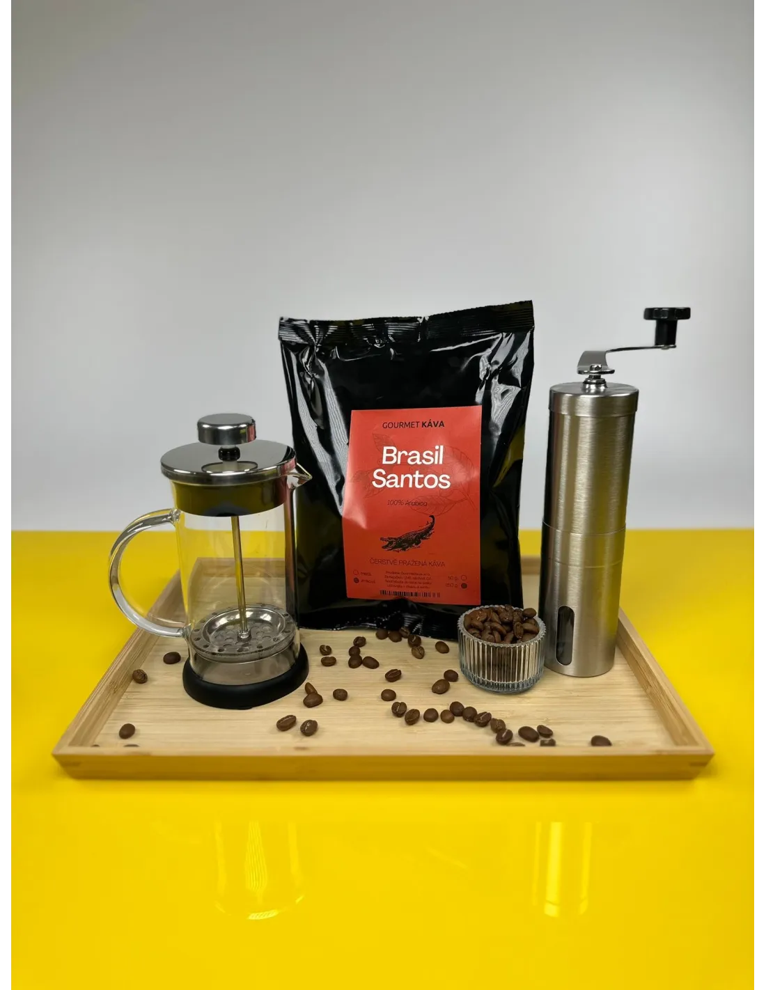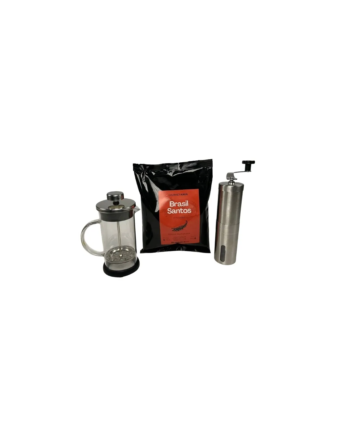 Pachetul conține o râșniță manuală de cafea Kaffia Tall, un pachet de 250g de cafea 100% arabica Brasil Santos și, nu în ultimul rând, un French press din inox de 350ml pentru prepararea ușoară a cafelei proaspete!