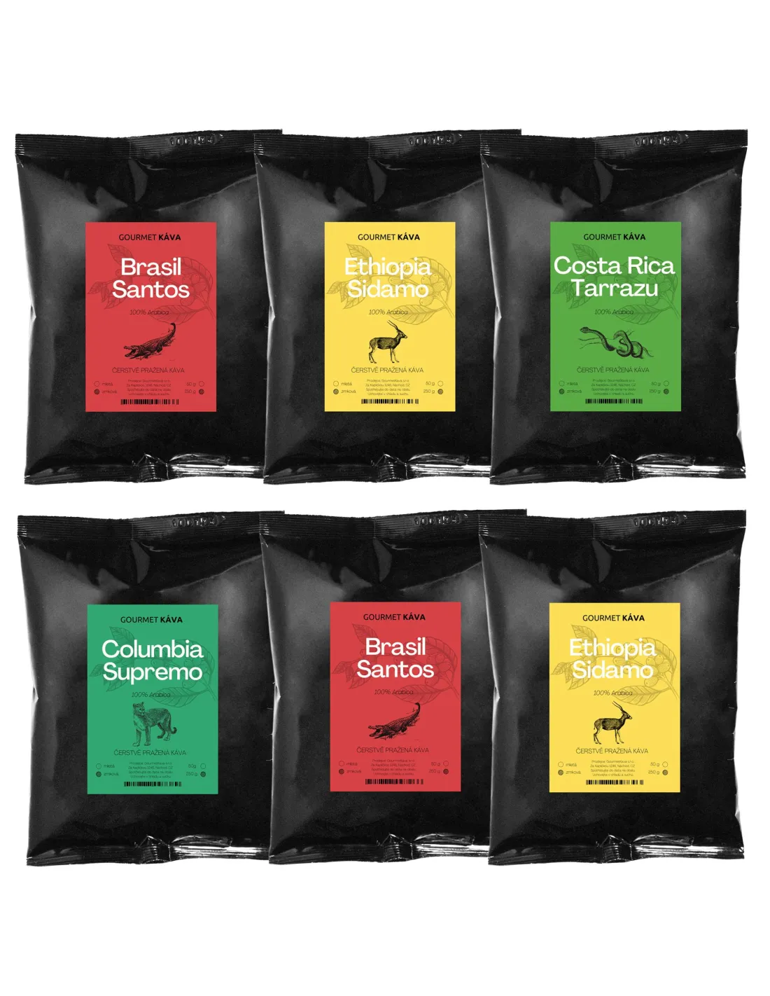 - Conținut: 3×250 g Brazilia Santos, 3×250 g Etiopia Sidamo, 3×250 g Costa Rica Tarrazú, 3×250 g Columbia Supremo.