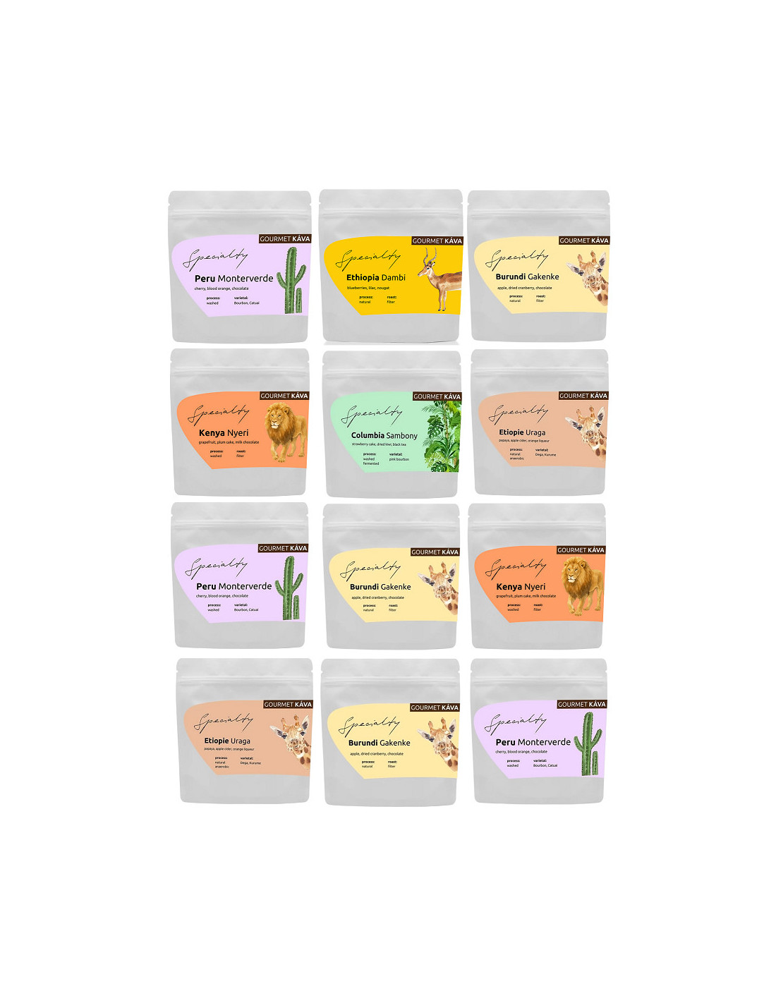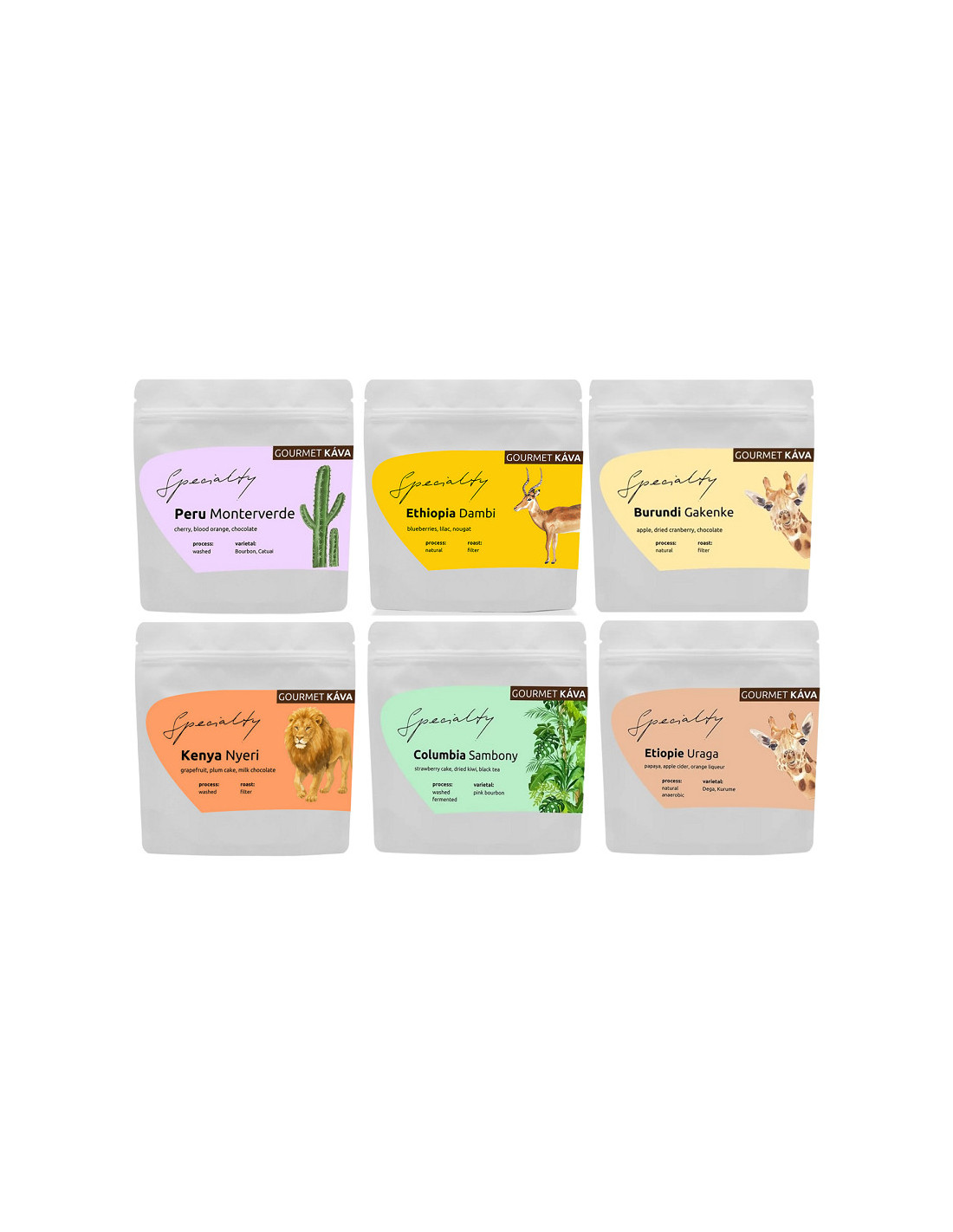 • 1x  Peru Monterverde 250g , 1x Burundi Gakenke 250g a 1x Etiopie Dambi Natural 250g, 1x Etiopie Uraga 250g, 1x Kolumbie D. Sambony 250g, 1x Kenya Nyeri 250g