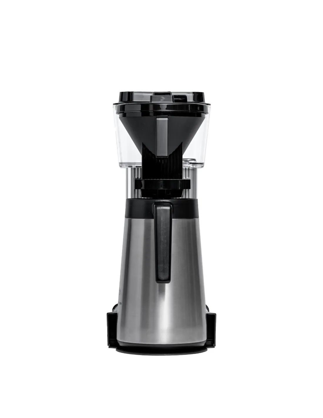 O caracteristică absolut esențială a acestui aparat de cafea este capacitatea sa de a menține o temperatură constantă de 92-96°C pe toată durata procesului de extracție. Turnarea uniformă a cafelei este asigurată de un cap special cu 9 găuri. În comparație cu Moccamaster KBG-741, acest model este echipat cu un recipient termo din oțel inoxidabil de 1,25 l, care menține cafeaua caldă mai mult timp. Nici măcar nu trebuie să vă faceți griji cu privire la complexitatea întregului dispozitiv. Aparatul de cafea are un singur buton de oprire și pornire și are funcții de oprire automată și de oprire a picurării.