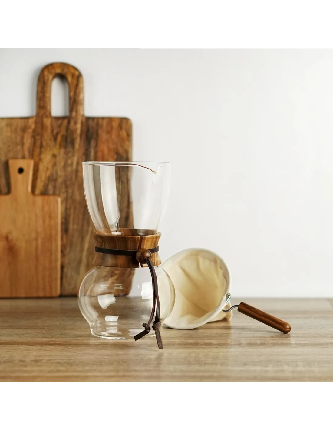 Woodneck este fabricat din sticlă termorezistentă de calitate Hario și, după cum sugerează și numele, "gâtul" cafetierei este completat de uncorset din lemn acoperit cu piele.