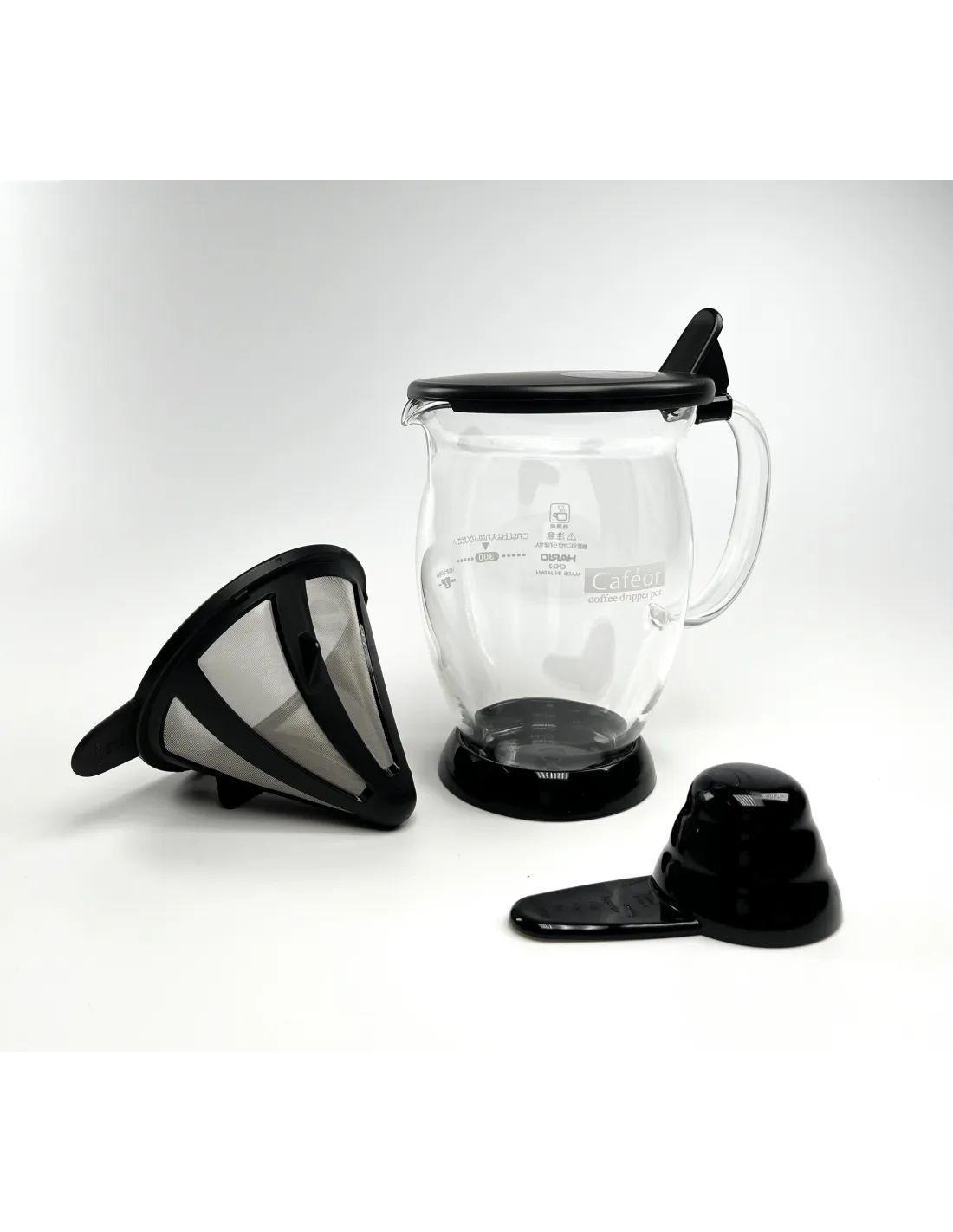 Cu elegantul Hario Cafeor, compania japoneză Hario a folosit un filtru metalic fin special, din care cafeaua extrasă curge direct într-o carafă din care cafeaua poate fi servită direct.