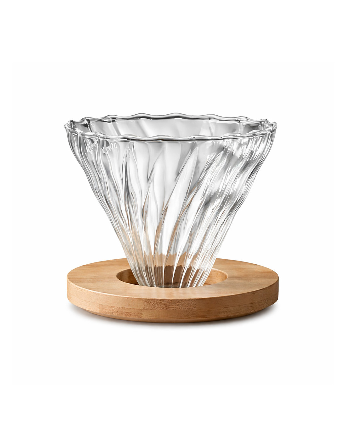 Acest picurător este conceput pentru prepararea manuală a cafelei filtru, cu accent pe extracție uniformă și stabilitate. Secțiunea din sticlă cu nervuri interne fine promovează un flux fluid al apei și un control mai bun asupra procesului de preparare. Baza din lemn asigură un loc ferm, izolare termică și un contrast plăcut de materiale.