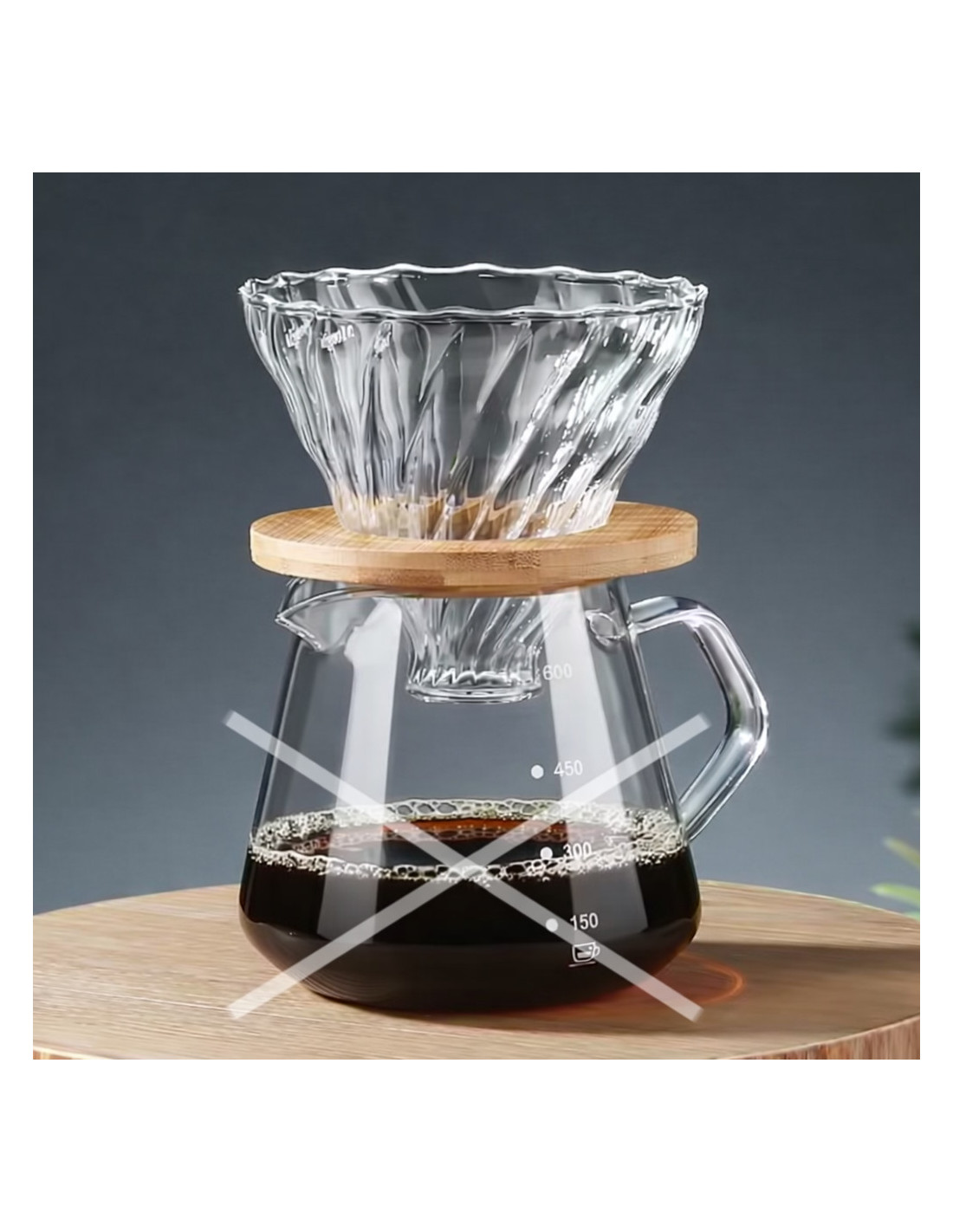 Picurător elegant din sticlă cu bază din lemn pentru cafea cu filtru. Combină funcționalitatea, designul curat și materialele naturale.
