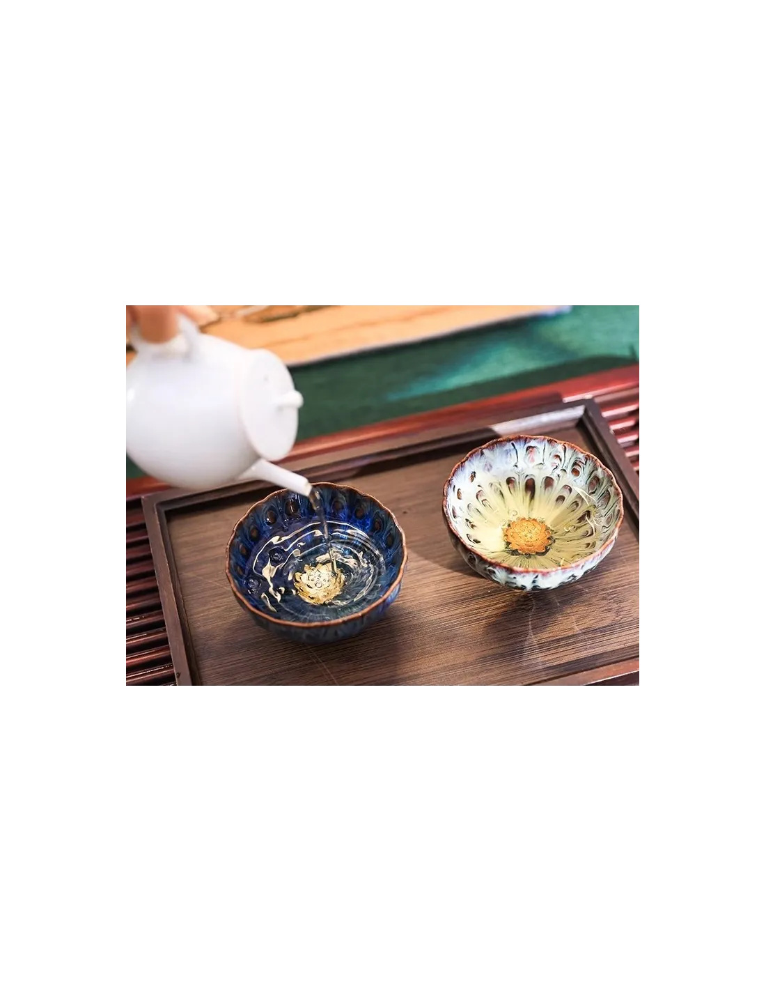 Un set elegant de cupe Kaffia Blossom cu un design realizat manual inspirat din motive florale. Pe fundul fiecărei cești există un motiv delicat de lotus , care iese cel mai bine în evidență atunci când se toarnă ceai ușor sau limpede.