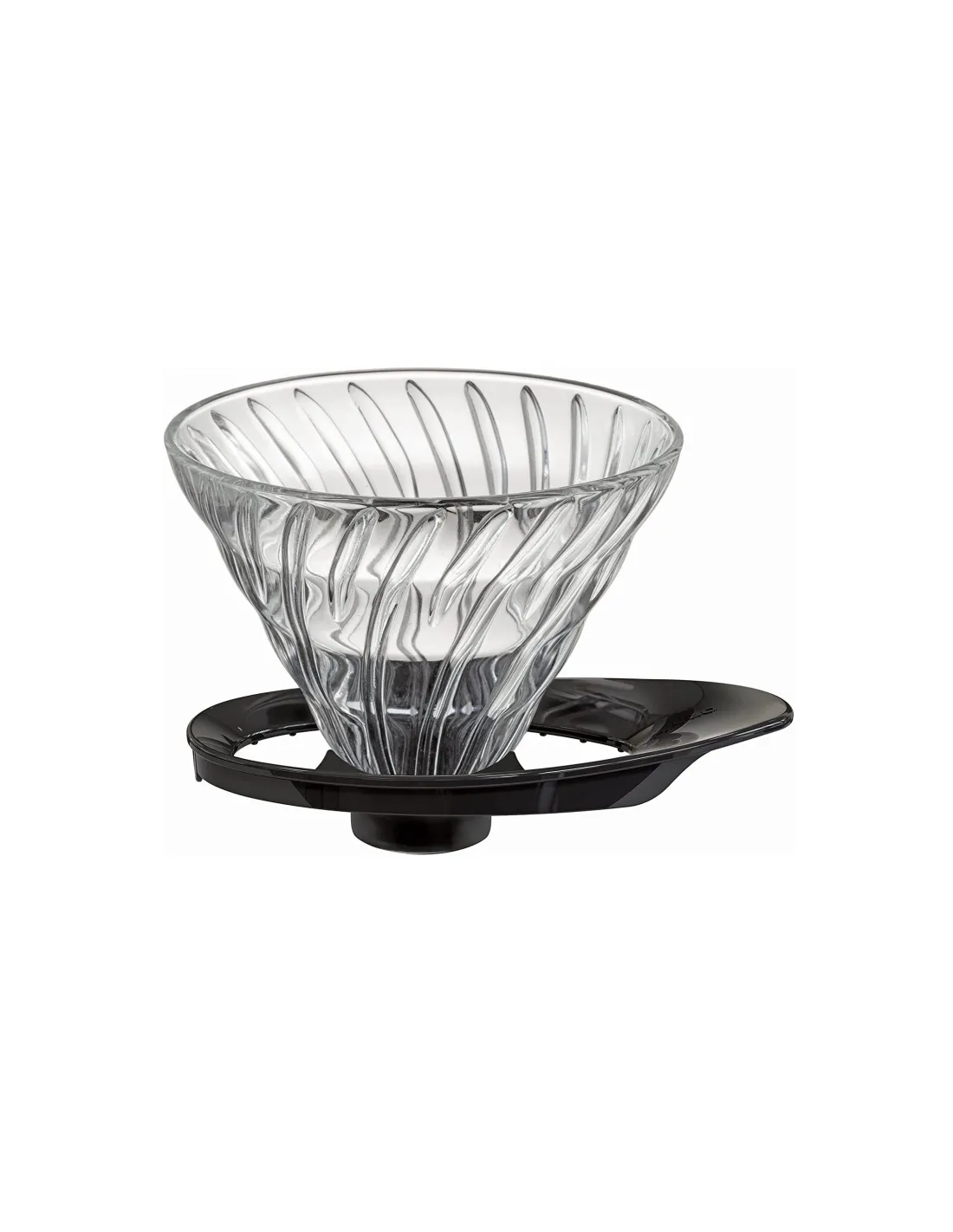 Dripper de sticlă Hario V60 pentru prepararea perfectă a 2–4 cești de cafea proaspăt filtrată.