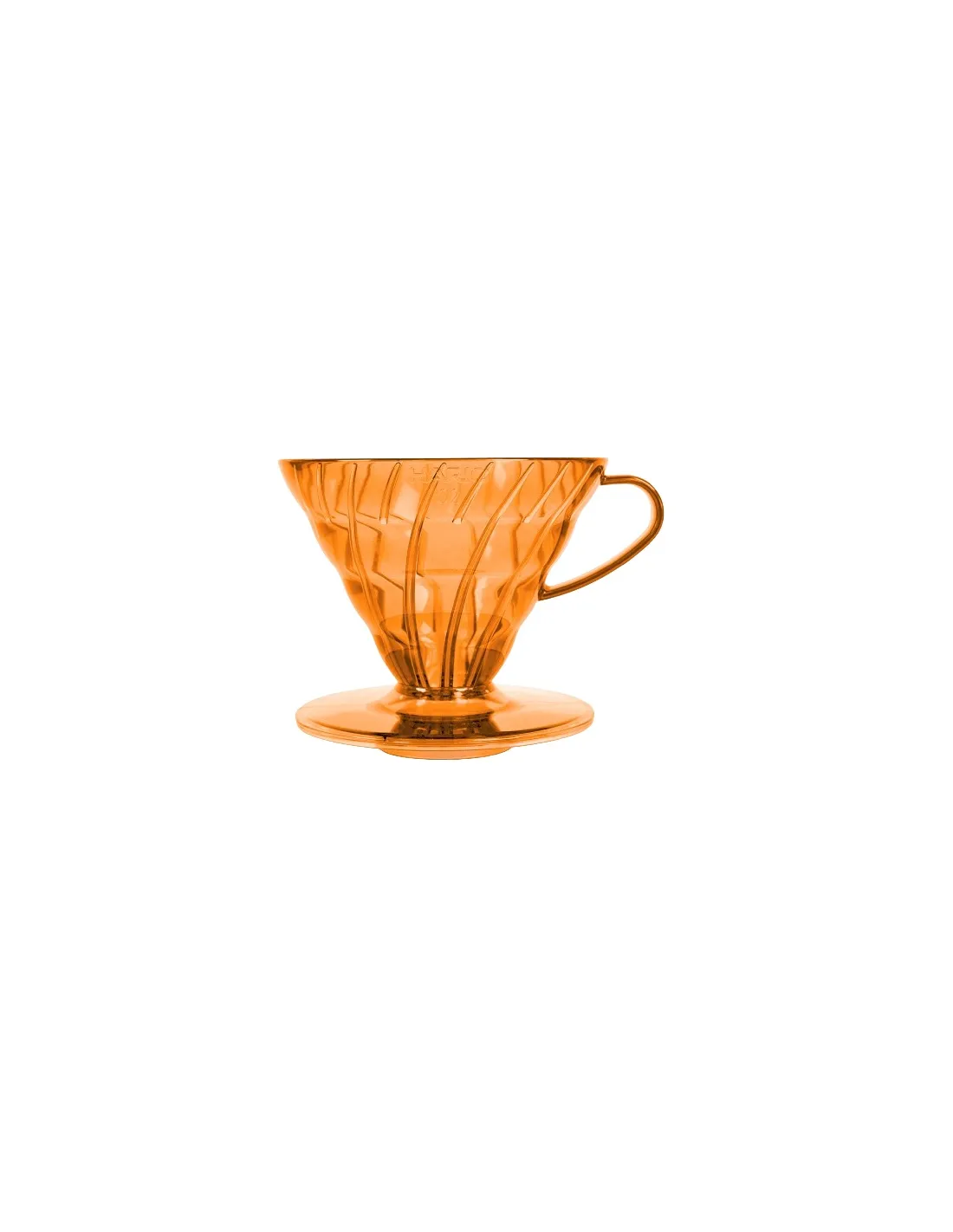 Picurător de plastic Hario V60 pentru prepararea ușoară a 1-4 cești de cafea cu filtru. Design portocaliu.