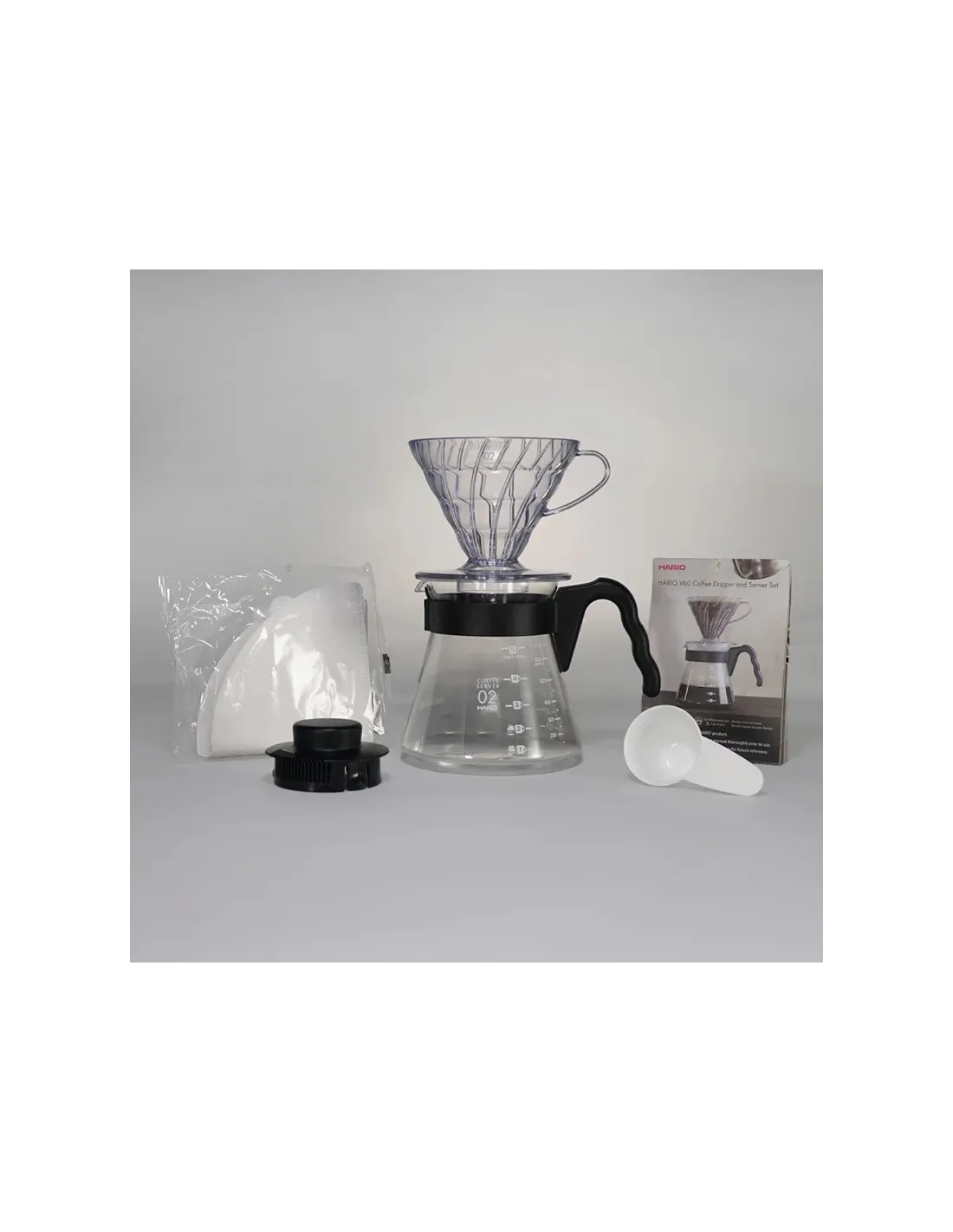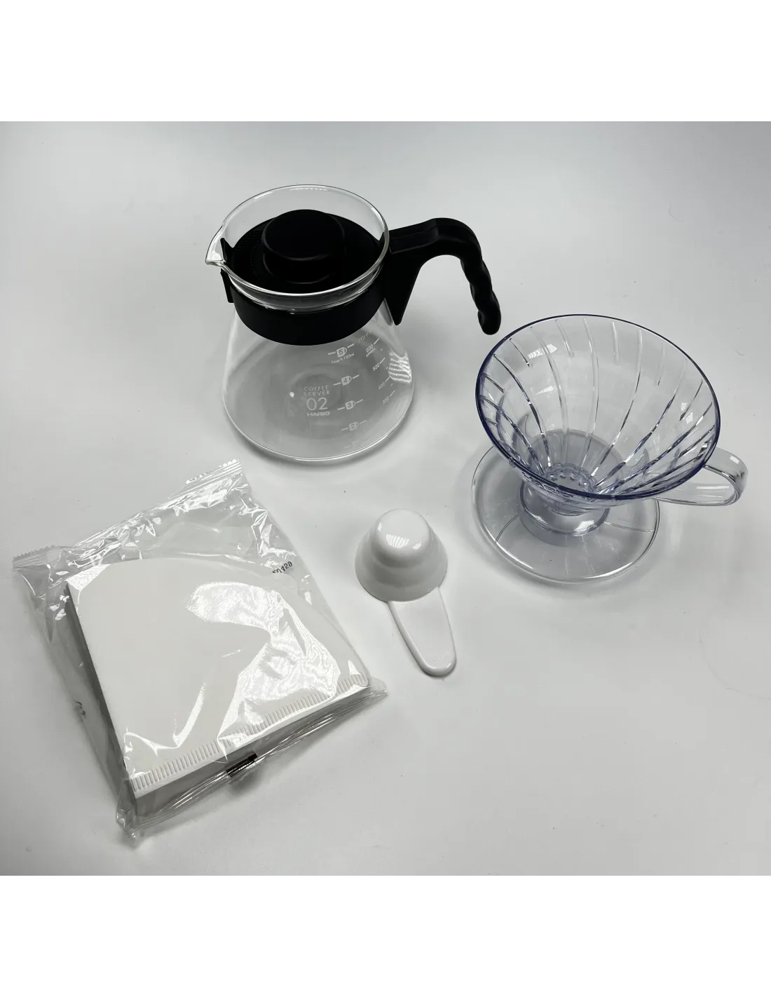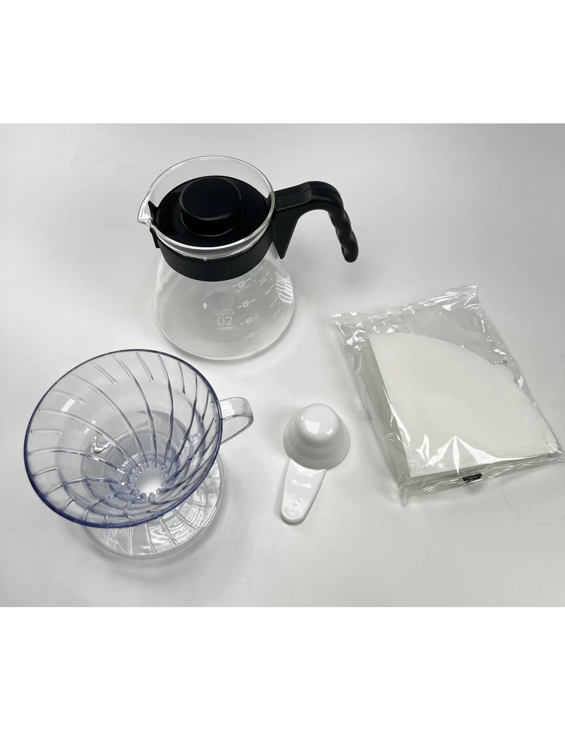 Setul conține un dripper din plastic Hario V60-02 pentru prepararea a 1-4 cești, un server din sticlă de 600 ml cu mâner și capac din plastic, 40 de filtre de hârtie albe și o linguriță de măsurare a cafelei din plastic. Pur și simplu, totul este reunit într-o calitate superioară Hario.