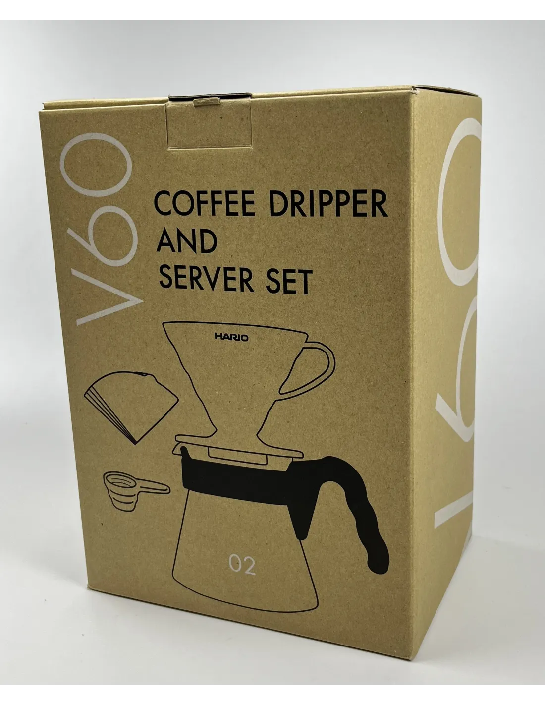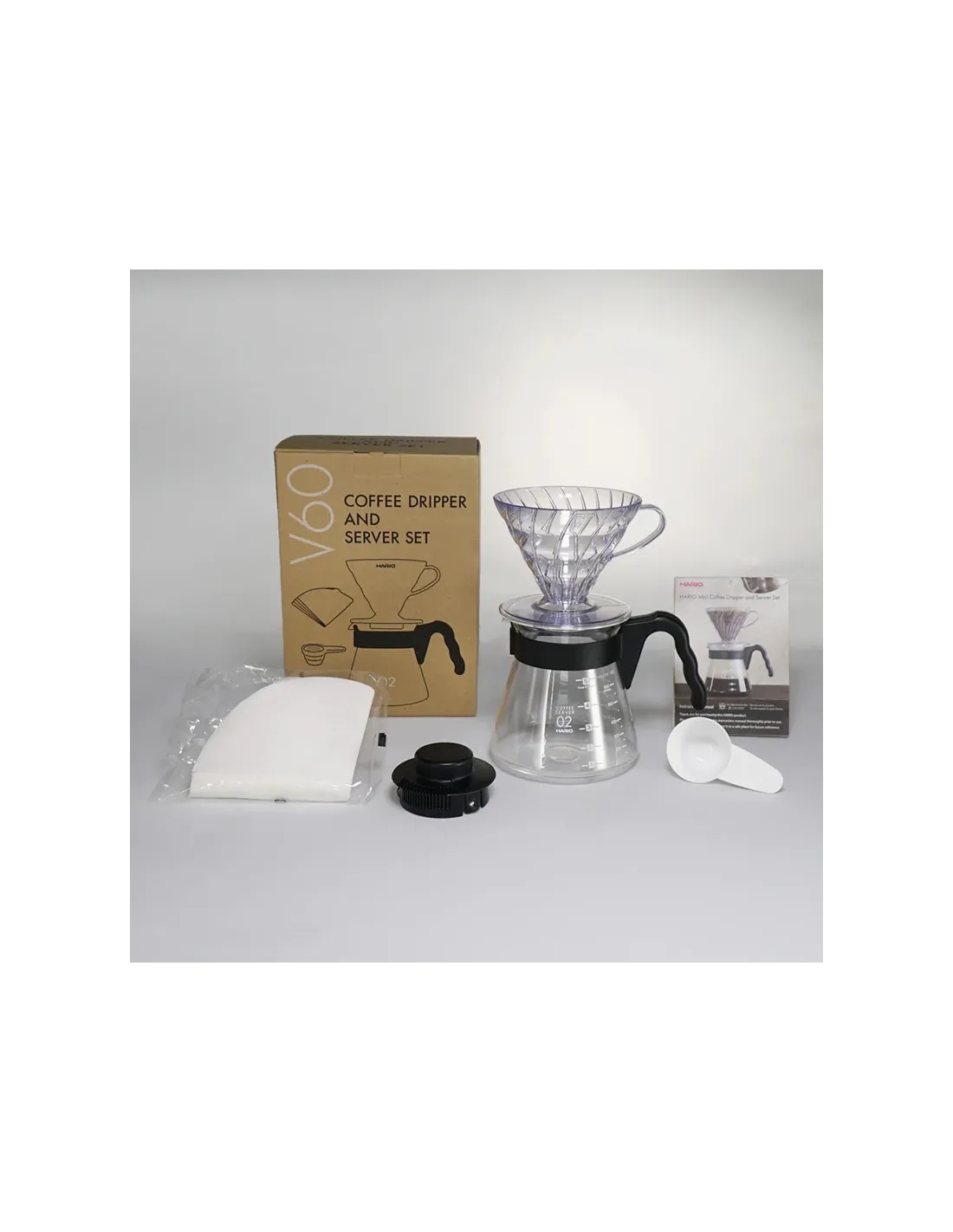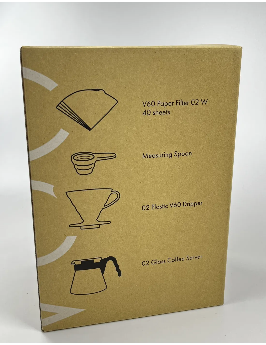 Setul conține un dripper din plastic Hario V60-02 pentru prepararea a 1-4 cești, un server din sticlă de 600 ml cu mâner și capac din plastic, 40 de filtre de hârtie albe și o linguriță de măsurare a cafelei din plastic. Pur și simplu, totul este reunit într-o calitate superioară Hario.