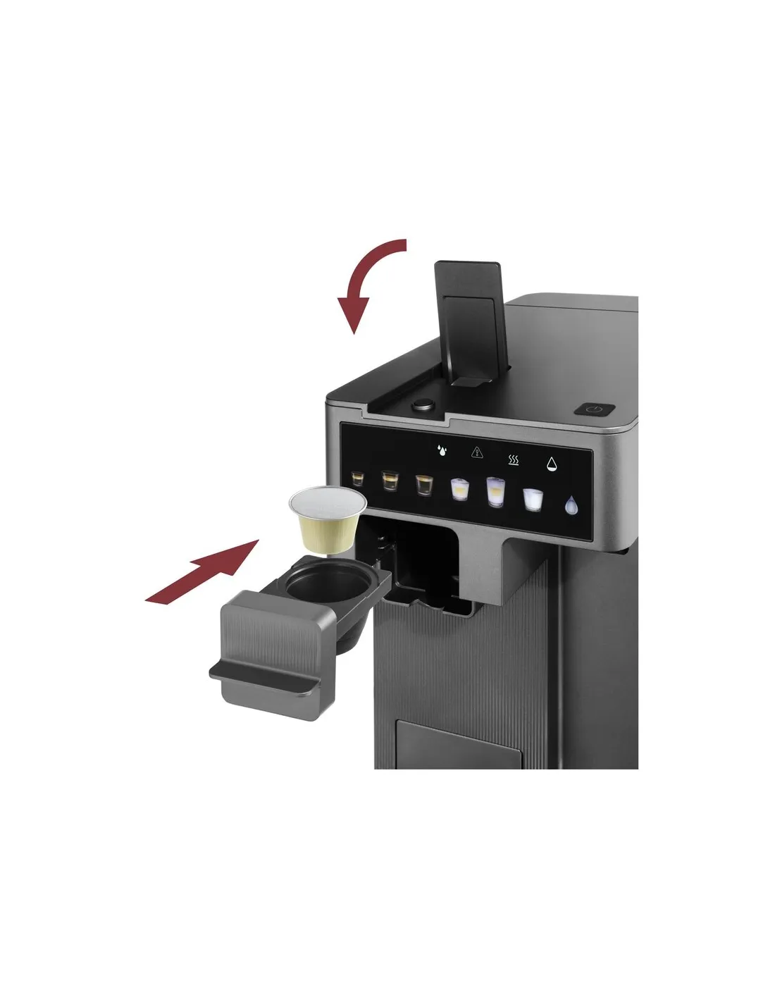 Aparatul espresso Catler ES 750 G Renzo este un aparat elegant și ușor de utilizat care vă permite să preparați espresso, cappuccino sau latte cu o spumă bogată. Ecranul tactil intuitiv face operarea simplă. Este compatibil cu capsule Nespresso®, Tchibo, NESCAFÉ® Dolce Gusto® și cafea măcinată. Acest model este ideal pentru experiențele zilnice de cafea datorită designului modern și funcționalității sale.
