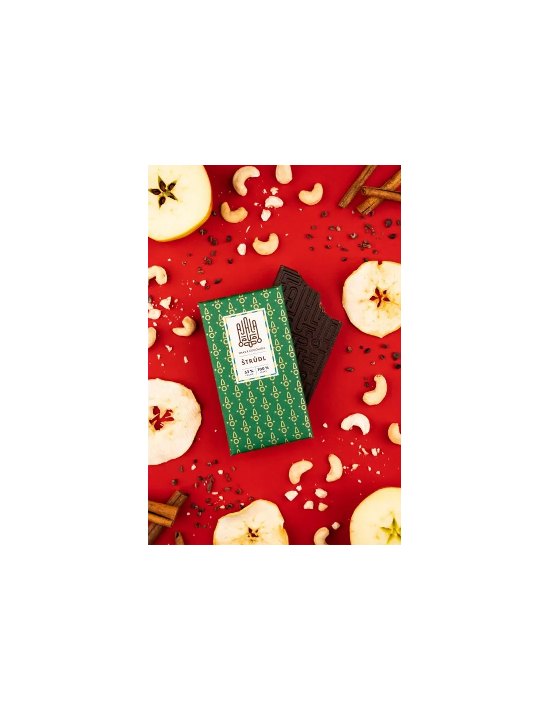Ingrediente: boabe de cacao organice, suc de trestie de zahăr uscat organic, unt de cacao organic, măr liofilizat, nuci de caju, scorțișoară.
