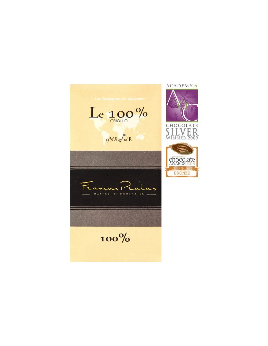 Ciocolată 100% preparată din boabe de cacao din soiul aromat Criollo cultivate în Madagascar. A primit o medalie de argint la Academia de Ciocolată din Londra în 2009.