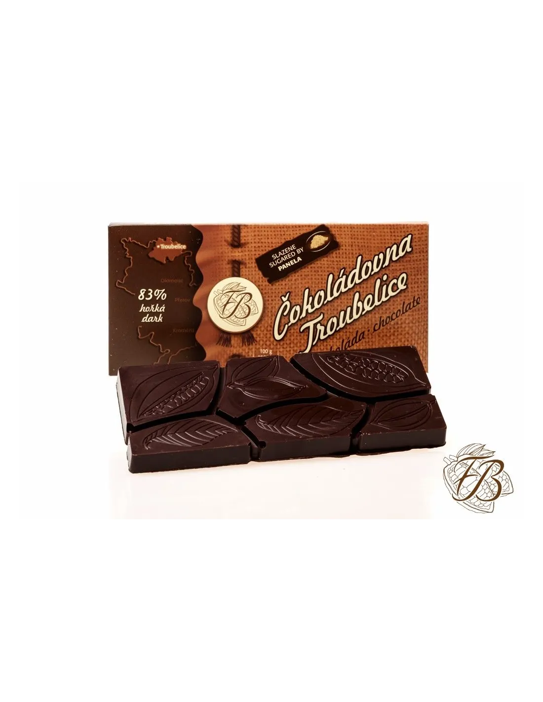 Ciocolatăneagră 83%, ciocolată neagră cu nuanțe de boabe de cacao acrișoare, îndulcită cu panou de suc de trestie de zahăr.