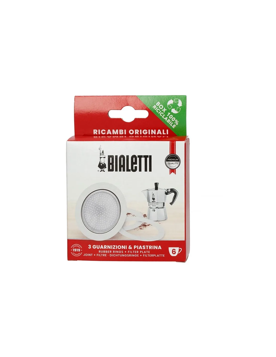 Set de 3 garnituri de cauciuc de rezervă cu filtru de înlocuire pentru oalele moka Bialetti de 6 cești din aluminiu.