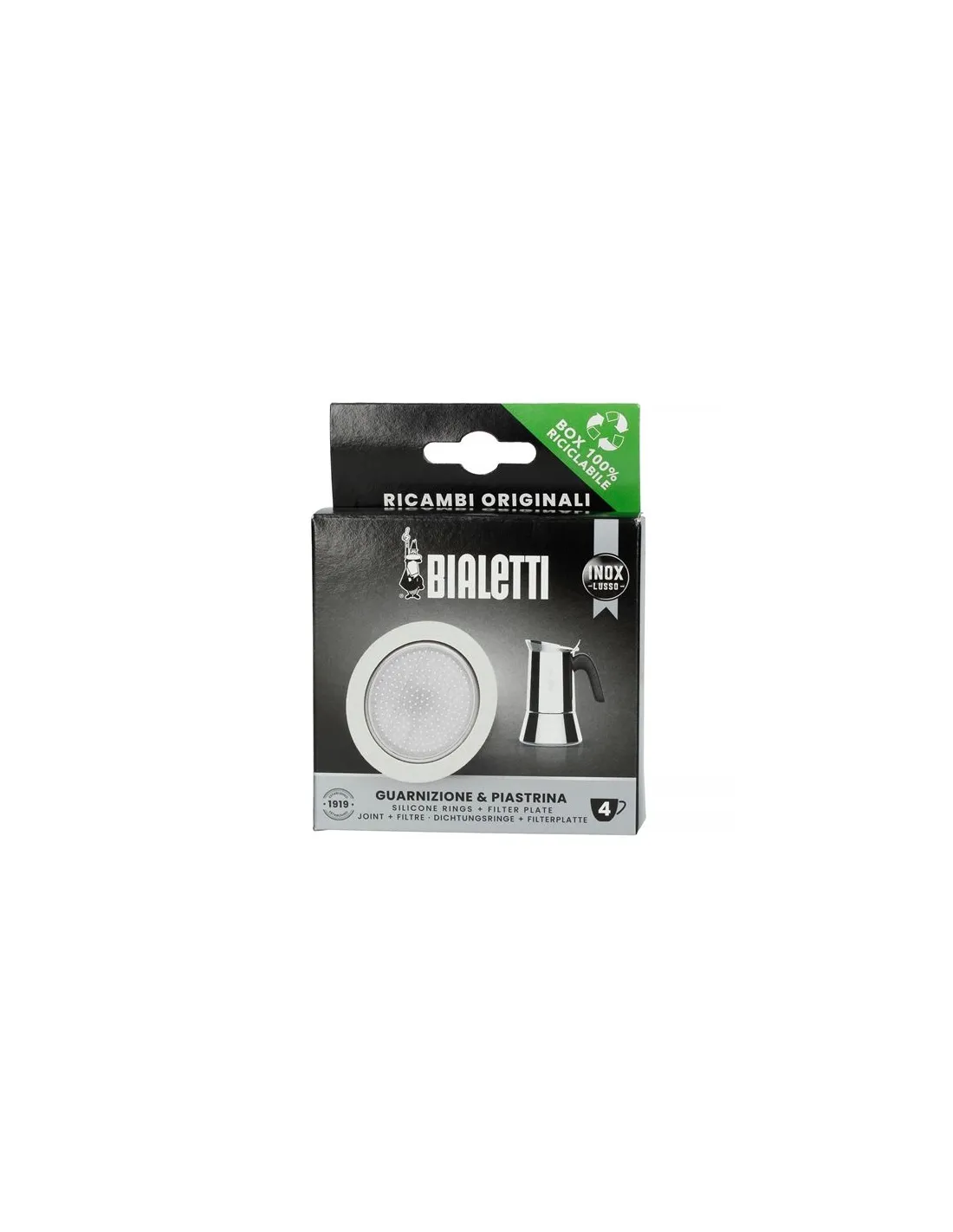 Pachetul conține 1x garnitură de silicon de rezervă pentru ceainice moka din oțel inoxidabil Bialetti de 4 cești și 1 x filtru de rezervă din oțel inoxidabil.