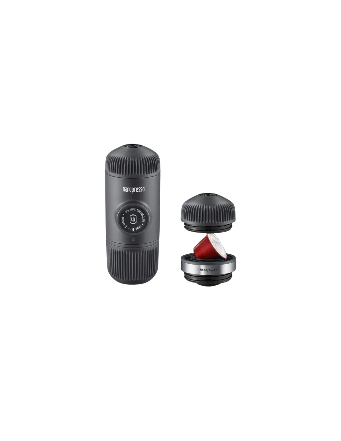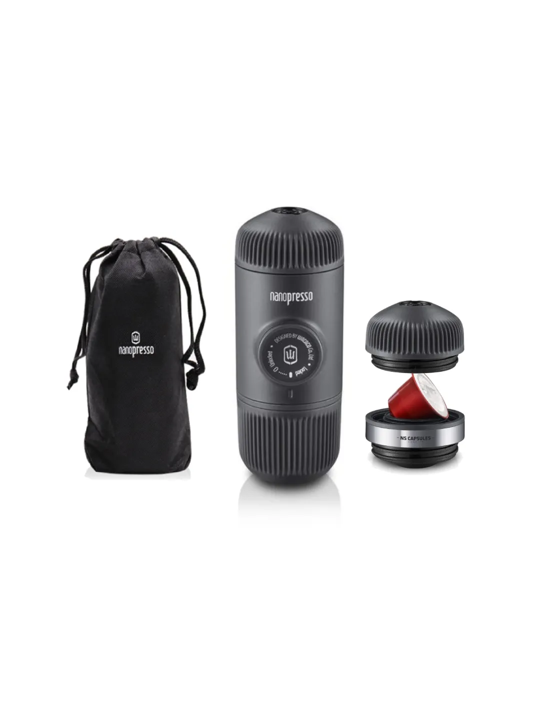 În pachet veți găsi aparatul Wacaco Nanopresso și adaptorul NS, care facilitează prepararea cafelei din capsule Nespresso® , L'OR sau Covim.