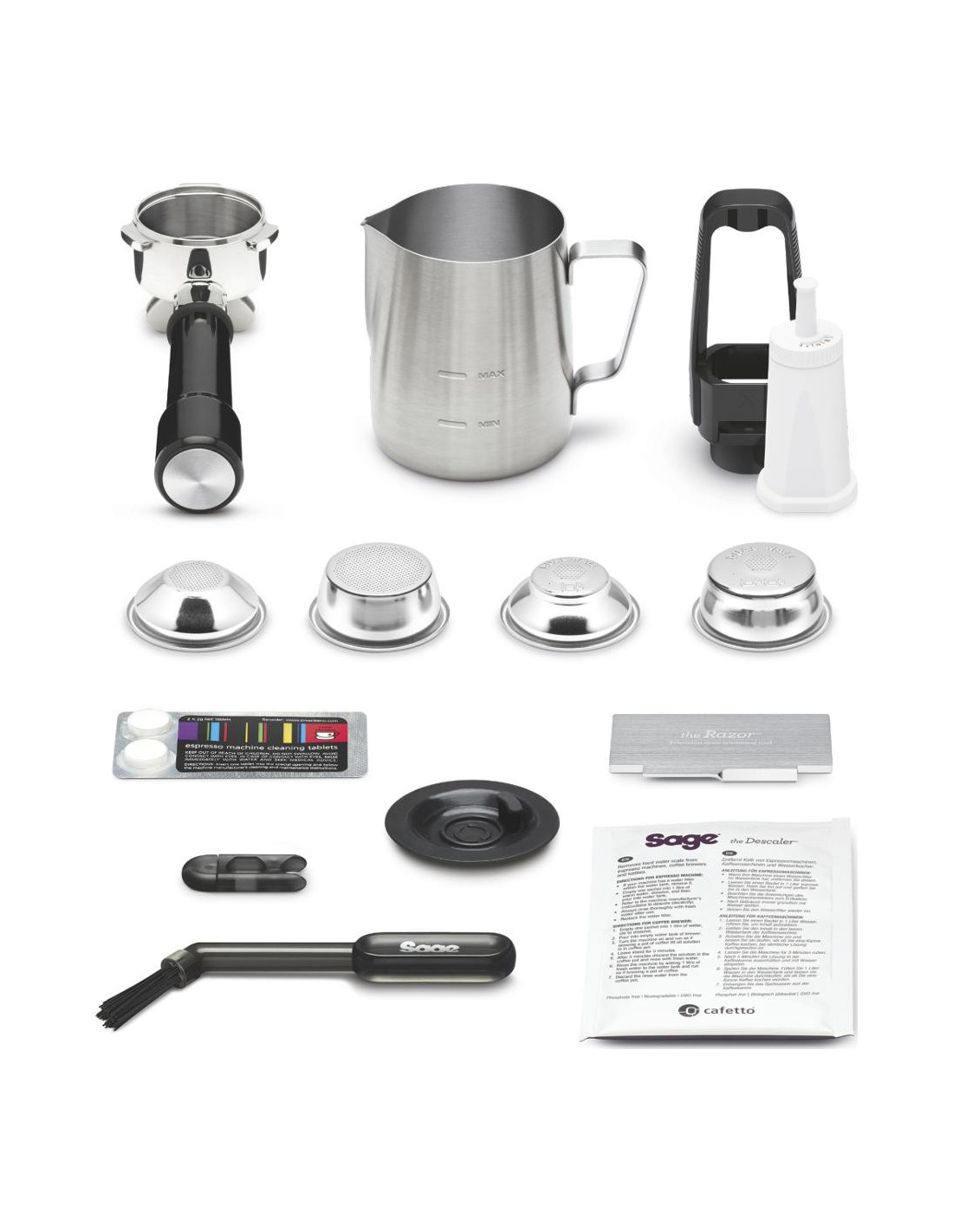 Include filtre profesionale, ceainic din oțel inoxidabil, instrument de aliniere a cafelei Razor™ și perie de curățare.