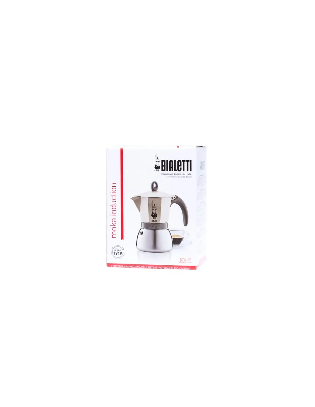 Legendara oală moka Bialetti cu opt pereți poate fi savurată acum și de posesorii de plite cu inducție, datorită bazei sale din oțel inoxidabil. Potrivit pentru 6 căni.