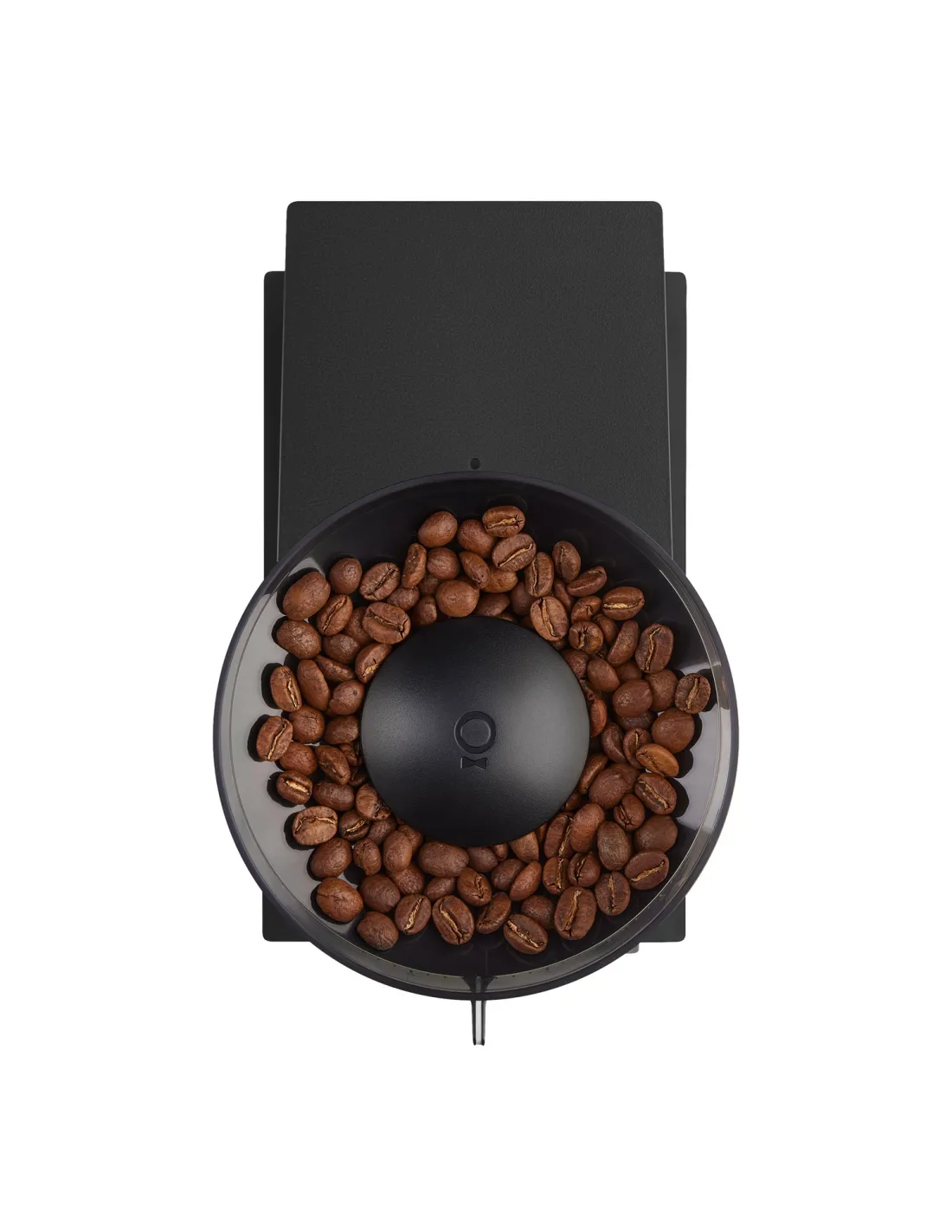 Designul în formă de picătură al recipientului reduce radical reținerea boabelor măcinate, iar tehnologia antistatică a recipientului de colectare o elimină o mizerie. Magnetul din partea de jos a recipientului de plastic ajută la reducerea zgomotului la măcinarea cafelei.