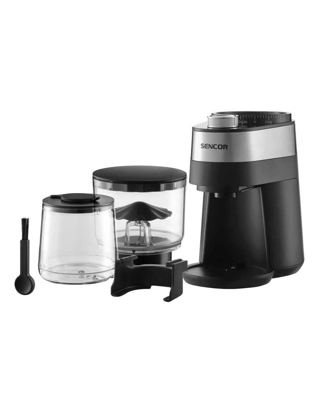 Conținutul pachetului: râșniță, recipiente pentru cafea, suport portafilter, perie de curățare