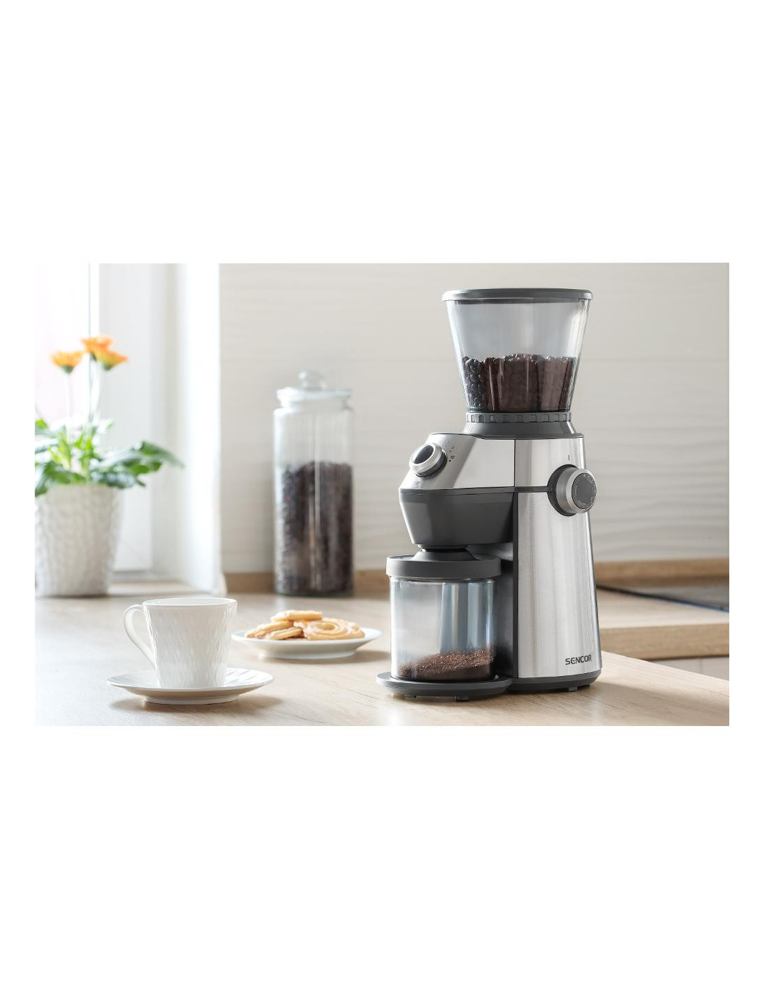 Cuva transparentă poate conține până la 350 g de boabe de cafea, în timp ce recipientul detașabil pentru cafea măcinată facilitează manipularea și curățarea. Partea superioară a râșniței poate fi îndepărtată cu ușurință, făcând întreținerea rapidă și convenabilă.