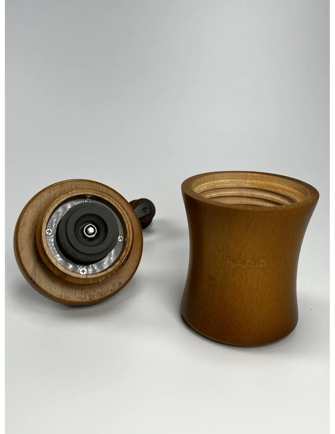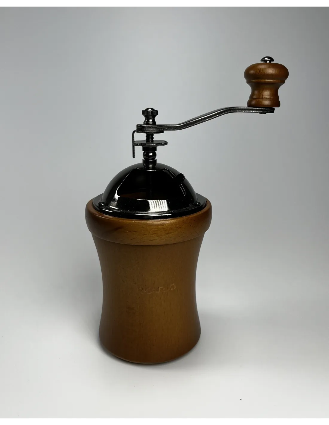 Cafeaua măcinată cade în partea de jos a corpului din lemn al râșniței, care poate conține până la 35 g de cafea măcinată.