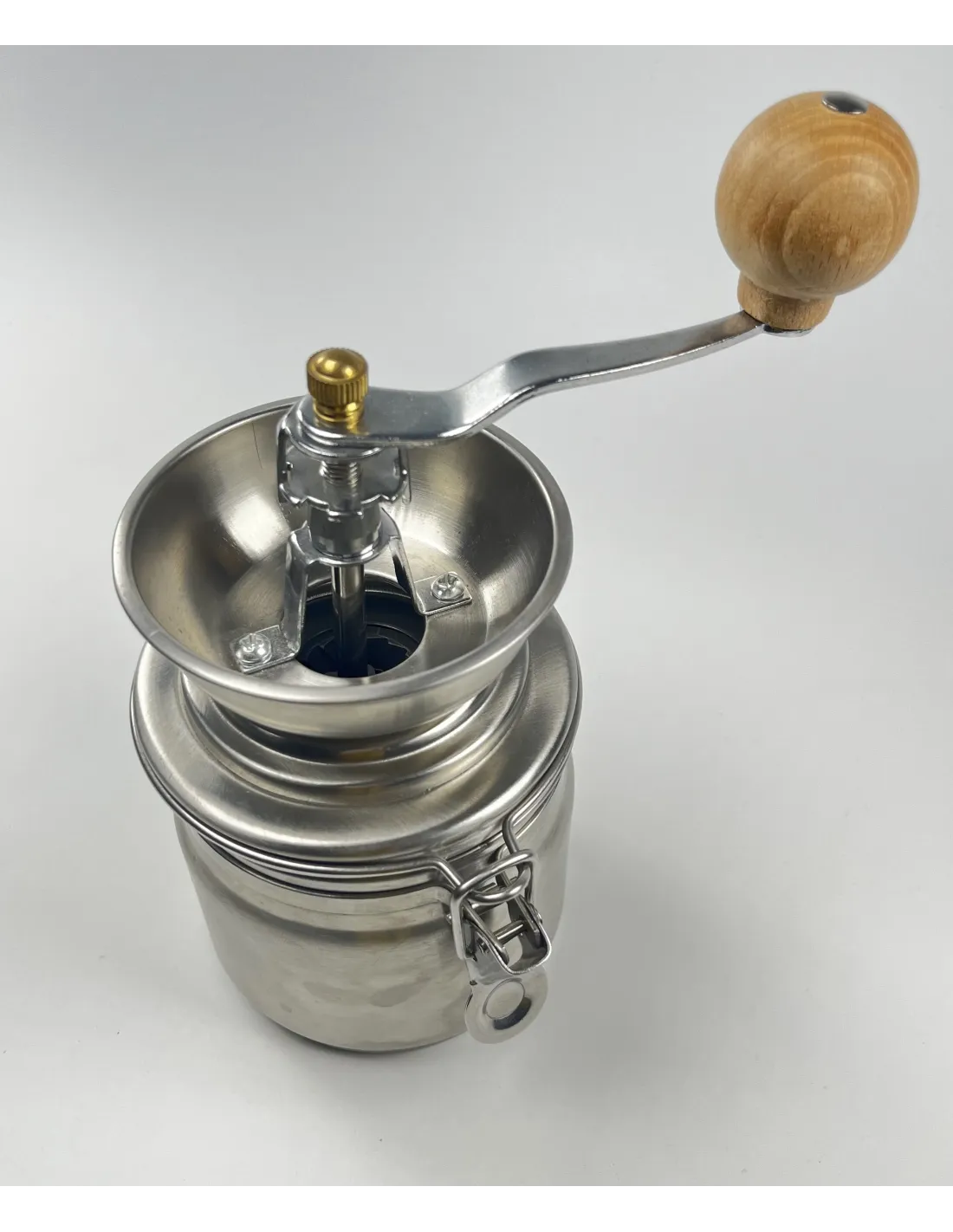 Moară de argint Kaffia dinoțel inoxidabil, cu mecanism de măcinare ceramică, măcinare cu grosime reglabilă și recipient mare pentru cafea măcinată.