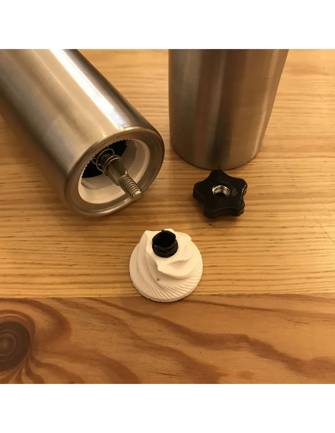Pietrele de măcinat sunt fabricate din ceramică, care este foarte delicată cu cafeaua. Pe râșniță puteți ajusta cu ușurință granulația măcinării, de la fină la grosieră. Râșnița se potrivește perfect cu AeroPress.