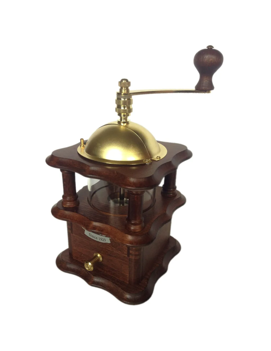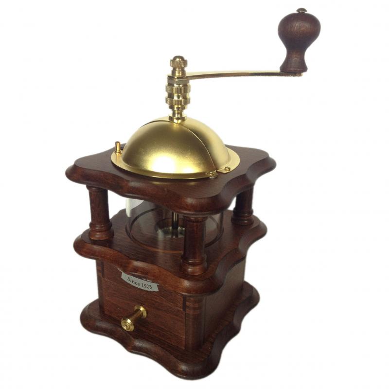 Râșnița de cafea Lodos Nostalgie din lemn de fag închis, cu o fereastră interesantă pentru cafea și o garanție de 10 ani de la compania cehă tradițională Lodos.