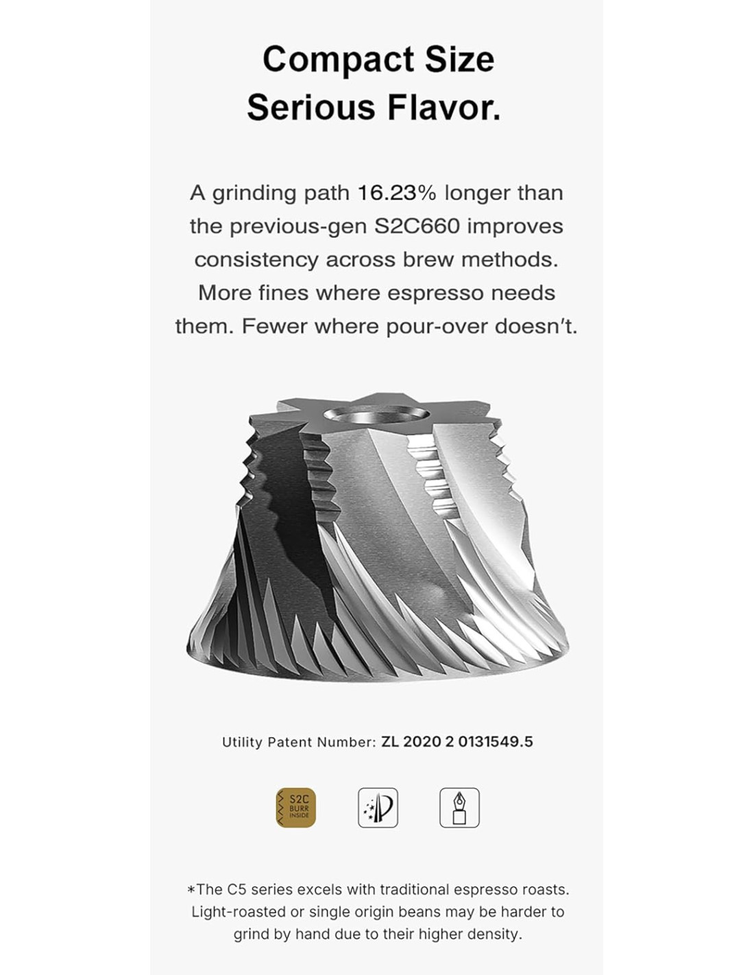 Polizorul de mână Timemore C5 Pro Black din noua generație a seriei C oferă o combinație excepțională de precizie, performanță și durabilitate. Dispune de pietrele de măcinat inovatoare S2C-042-III cu un diametru de 42 mm, care permit o măcinare mai rapidă, mai uniformă și mai stabilă decât modelele anterioare.