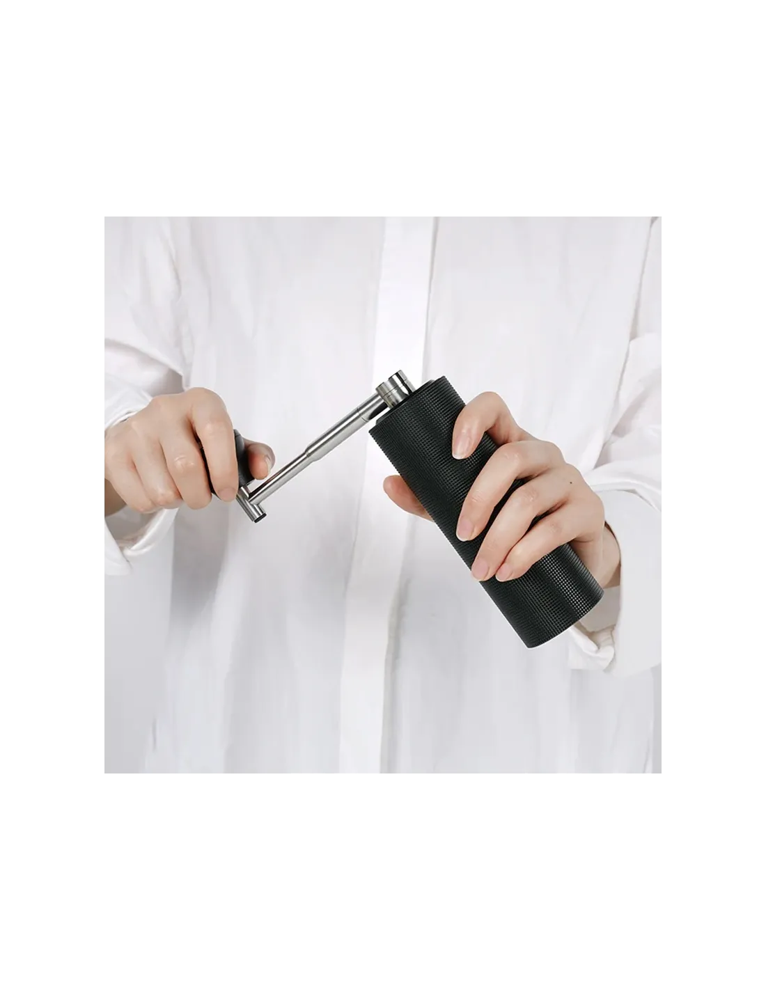 Suprafața texturată asigură că mașina de măcinat nu va cădea din mână și că măcinarea va fi confortabilă. Cu un diametru de numai aprox. 5 cm, o înălțime cu mâner de aprox. 16 cm și o greutate redusă, râșnița Timemore va satisface așteptările tuturor călătorilor. Capătul hexagonal al mânerului asigură o șlefuire confortabilă și o aplicare ușoară a mânerului rabatabil.