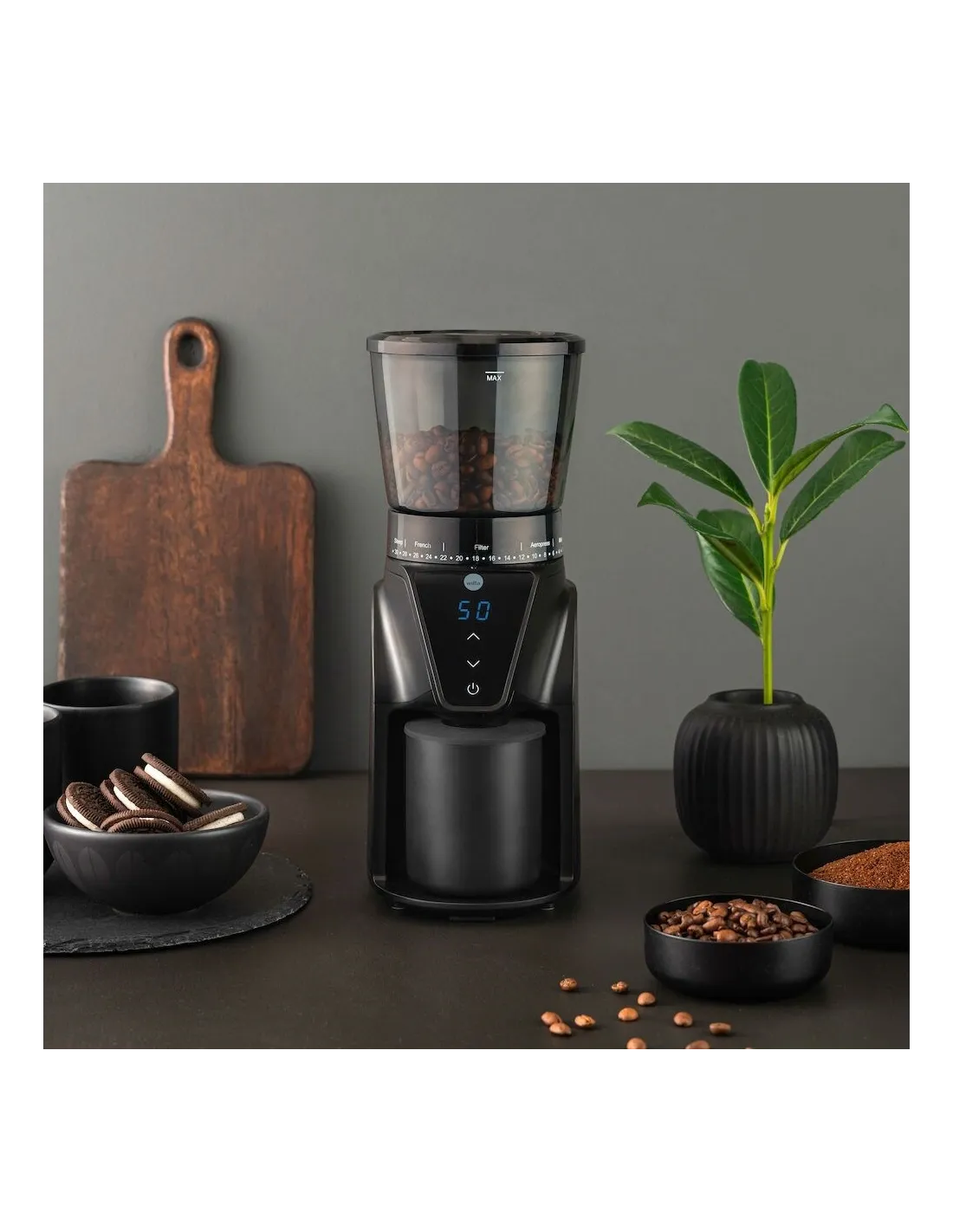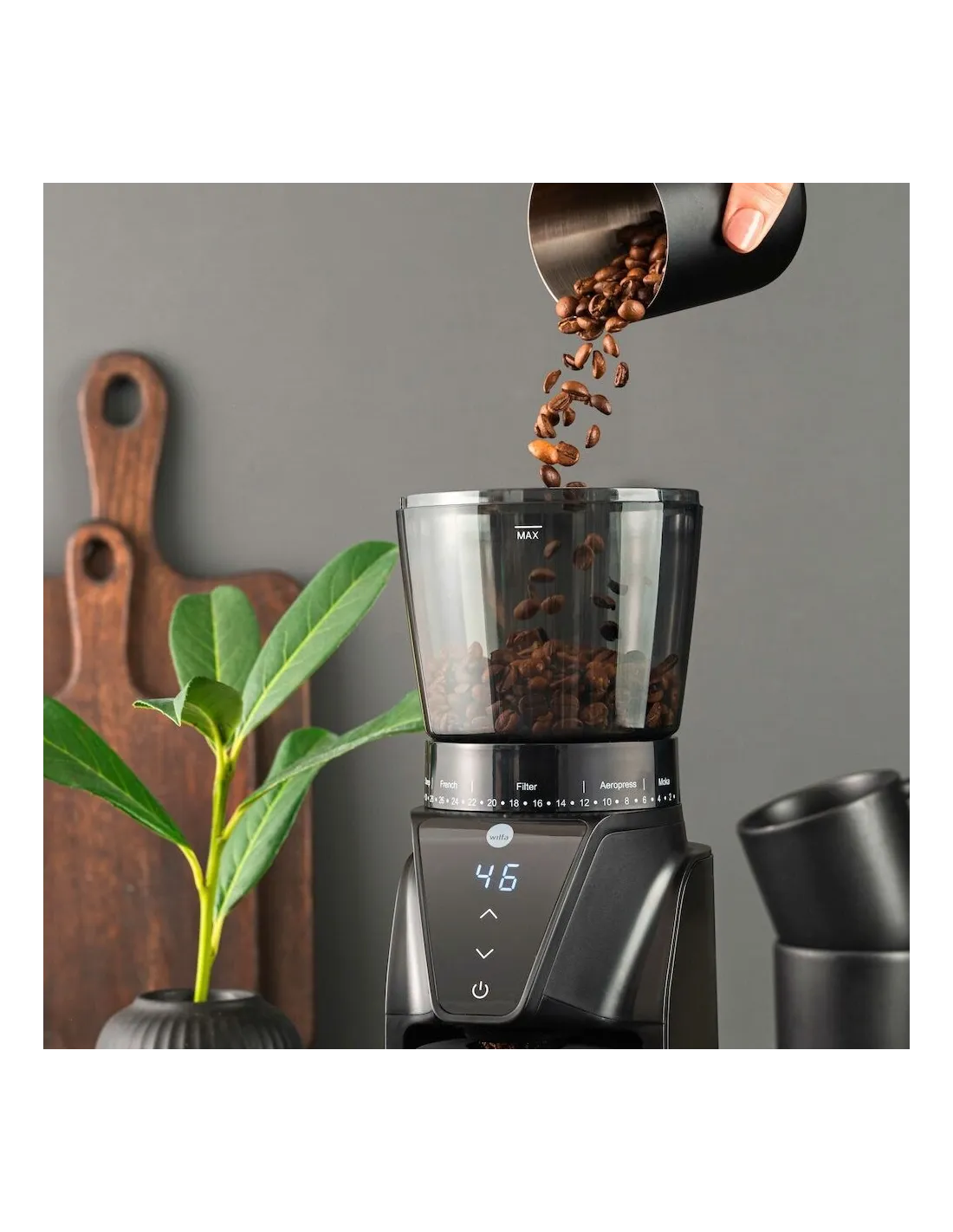 Râșnița de cafea electrică de uz casnic Wilfa Balance CG1B-275 este potrivită pentru a măcina totul, de la cafeaua moca la cea de presă franceză. Puteți alege dintre 31 de setări de măcinare, precum și un cronometru pe ecran.
