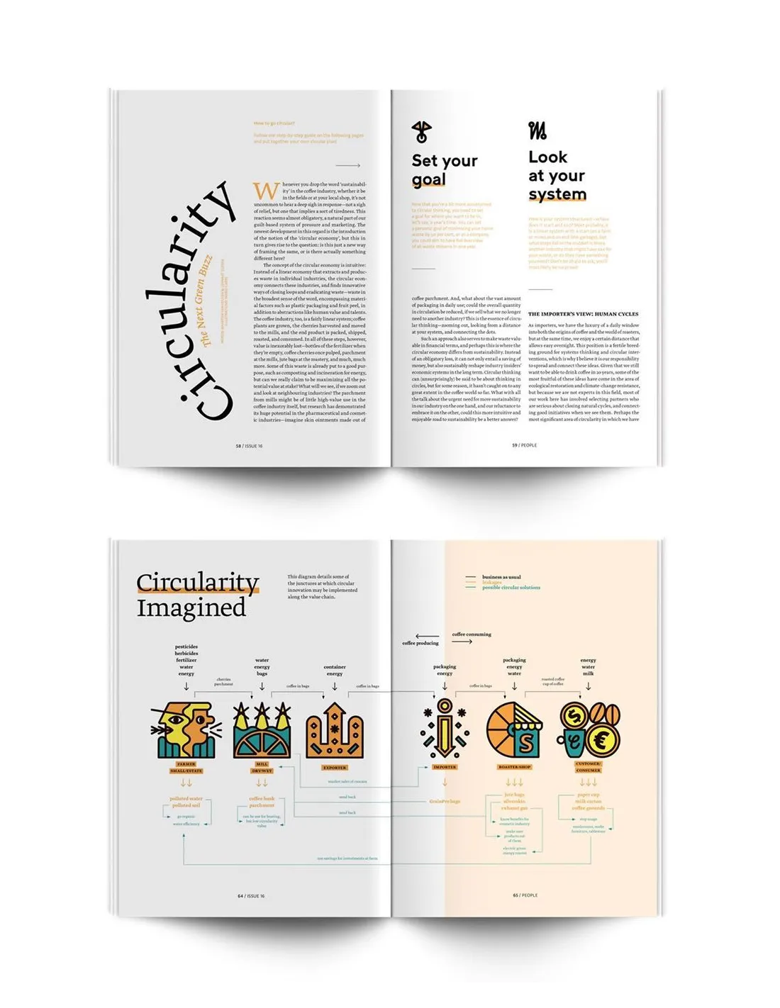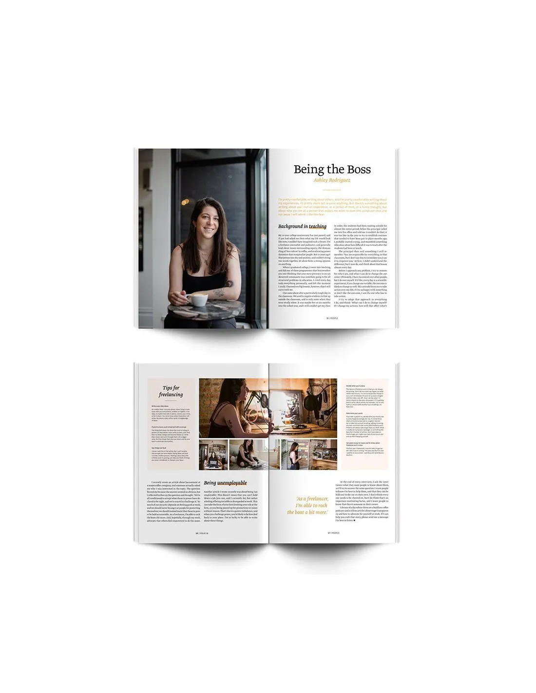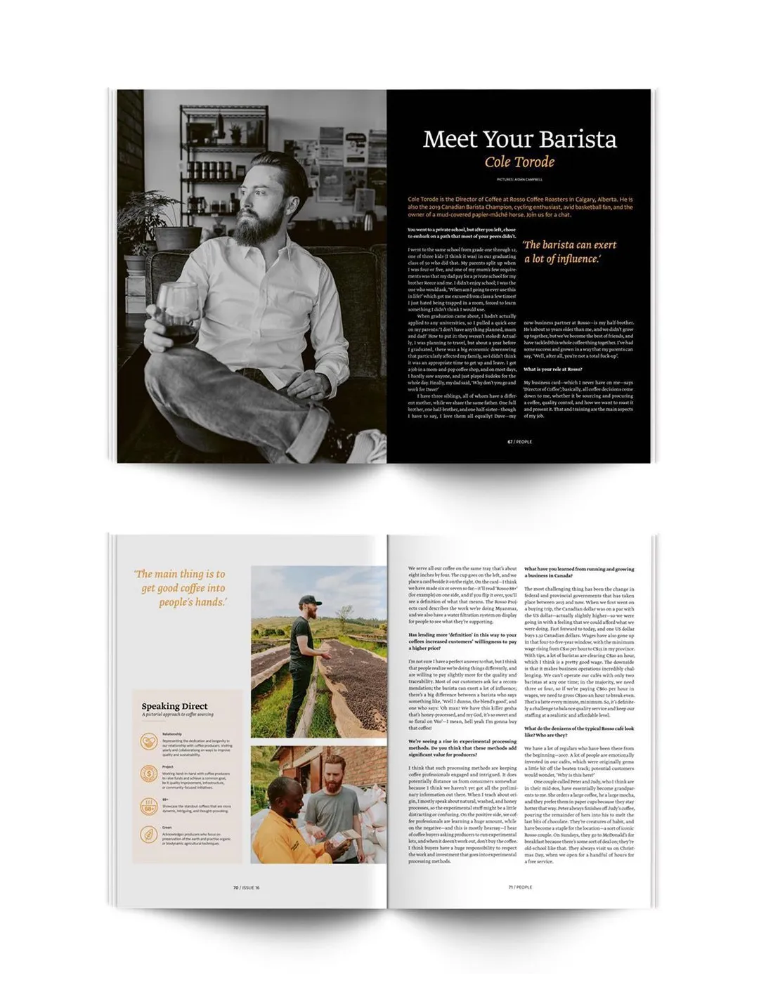 Capitolul "Oameni" explorează personalitățile care alcătuiesc lumea cafelei. În el, facem cunoștință cu maestrul canadian Cole Torode, care ne prezintă începuturile carierei sale, competiția și gândurile sale despre comerțul direct. Articolul lui Ashley Rodriguez explorează profesia de șef independent și oferă sfaturi și trucuri care au ajutat-o să câștige experiență și autodisciplină.