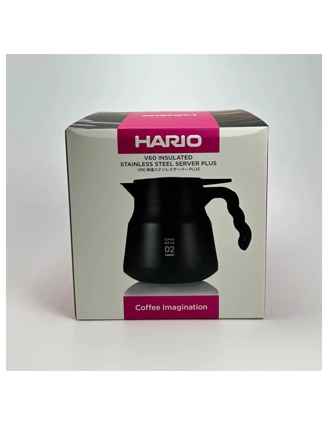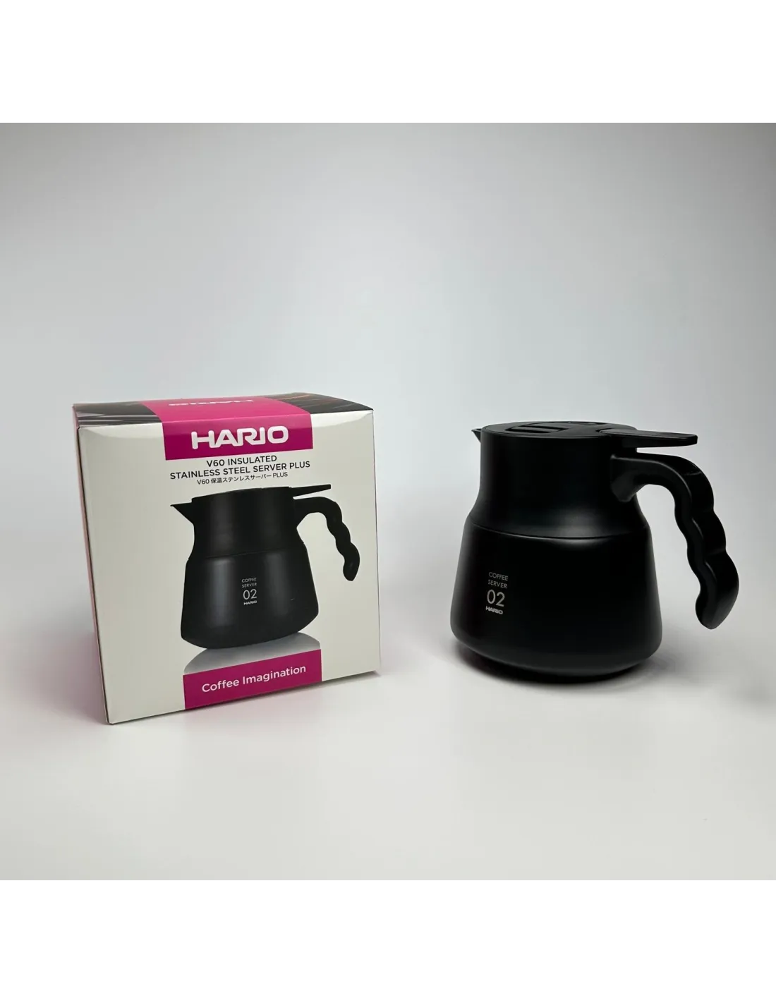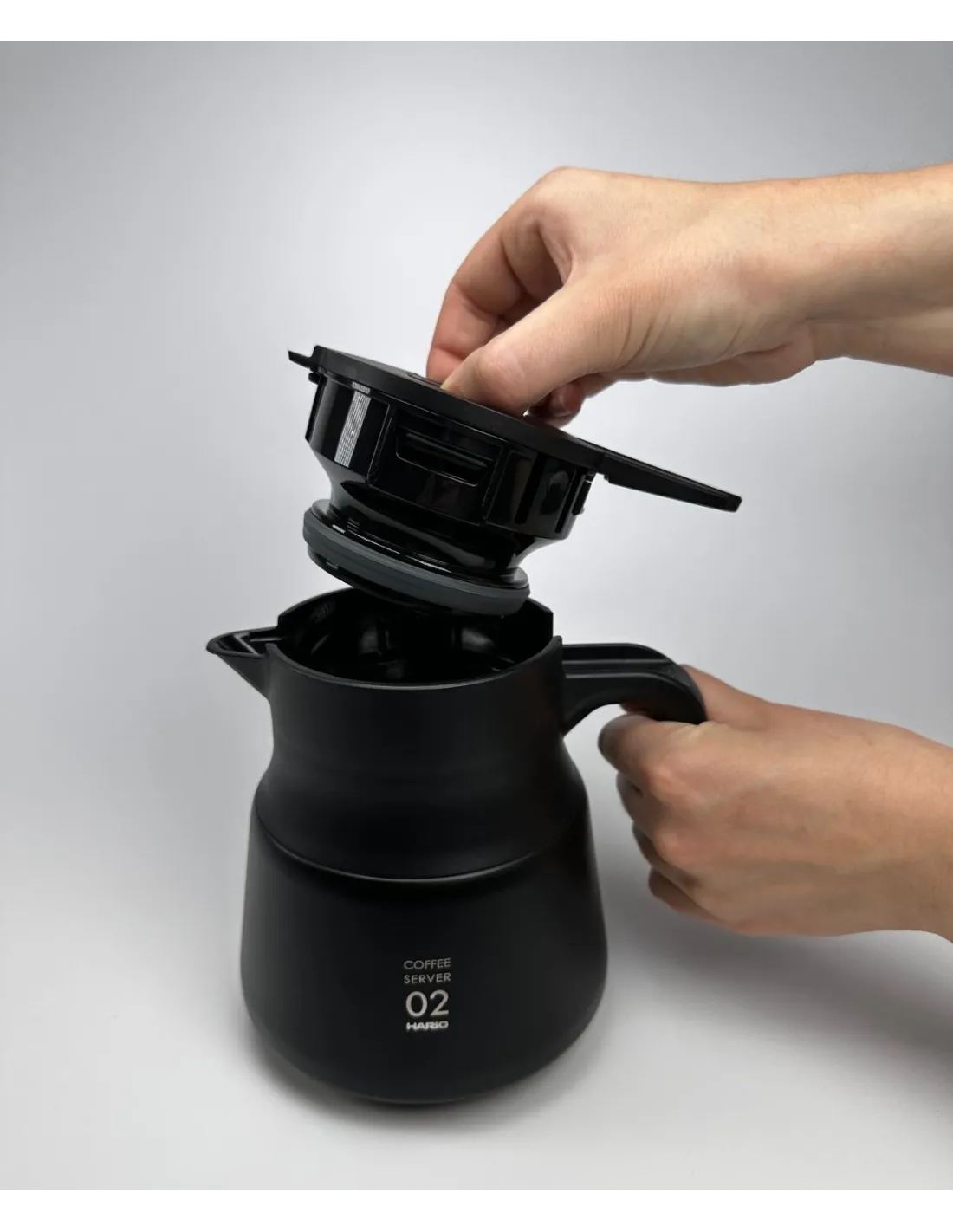 Server Hario V60 Thermo din oțel inoxidabil cu pereți dubli, sigilat în vid, pentru servirea profesională a cafelei proaspete și fierbinți sau a altor băuturi. Volum: 600ml.