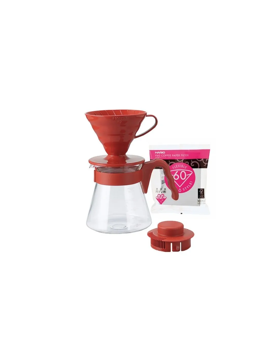 Kitul include un picurător Hario V60-02 din plastic roșu pentru prepararea a 1-4 cești, un ceainic Hario din sticlă cu capac și capacitate de 600 ml, 40 de filtre din hârtie nealbită și o lingură de cafea din plastic. Pur și simplu toate frumos puse împreună în calitate premium Hario.
