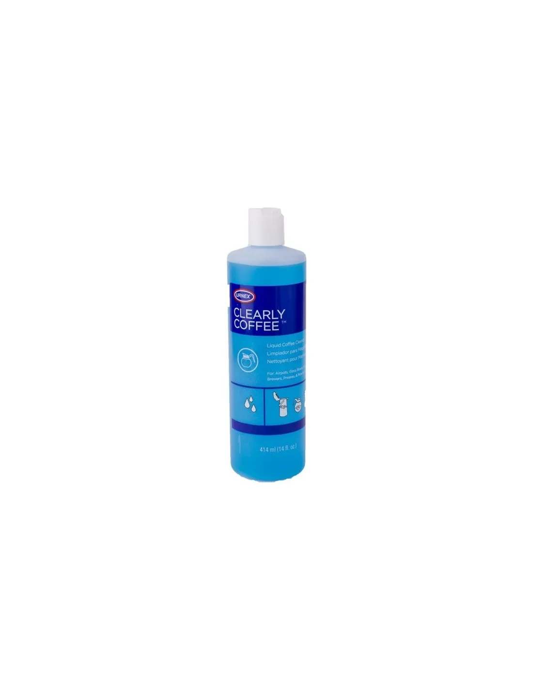 Produsul de curățare Clearly Coffee de la marca americană Urnex pentru îndepărtarea uleiurilor și depunerilor de cafea de pe aparatele de cafea sau de pe recipientele de sticlă. Volum 414ml.