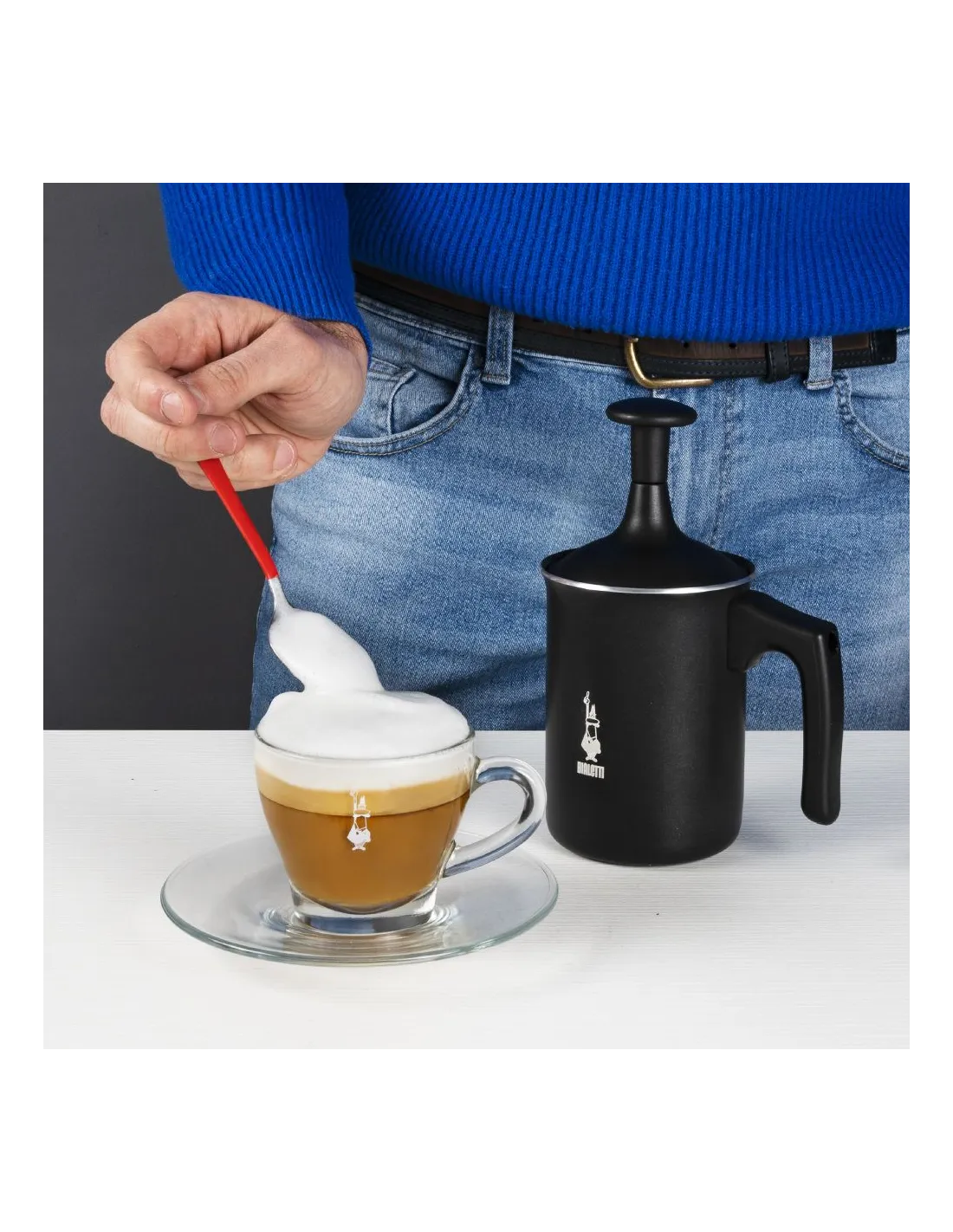 Creați o spumă de lapte frumos de groasă și catifelată pentru cappuccino sau caffé latte de casă cu ajutorul spumatorului de lapte de la marca italiană Bialetti. Capacitate pentru 166 ml de lapte (recipientul este de 3 ori mai mare).