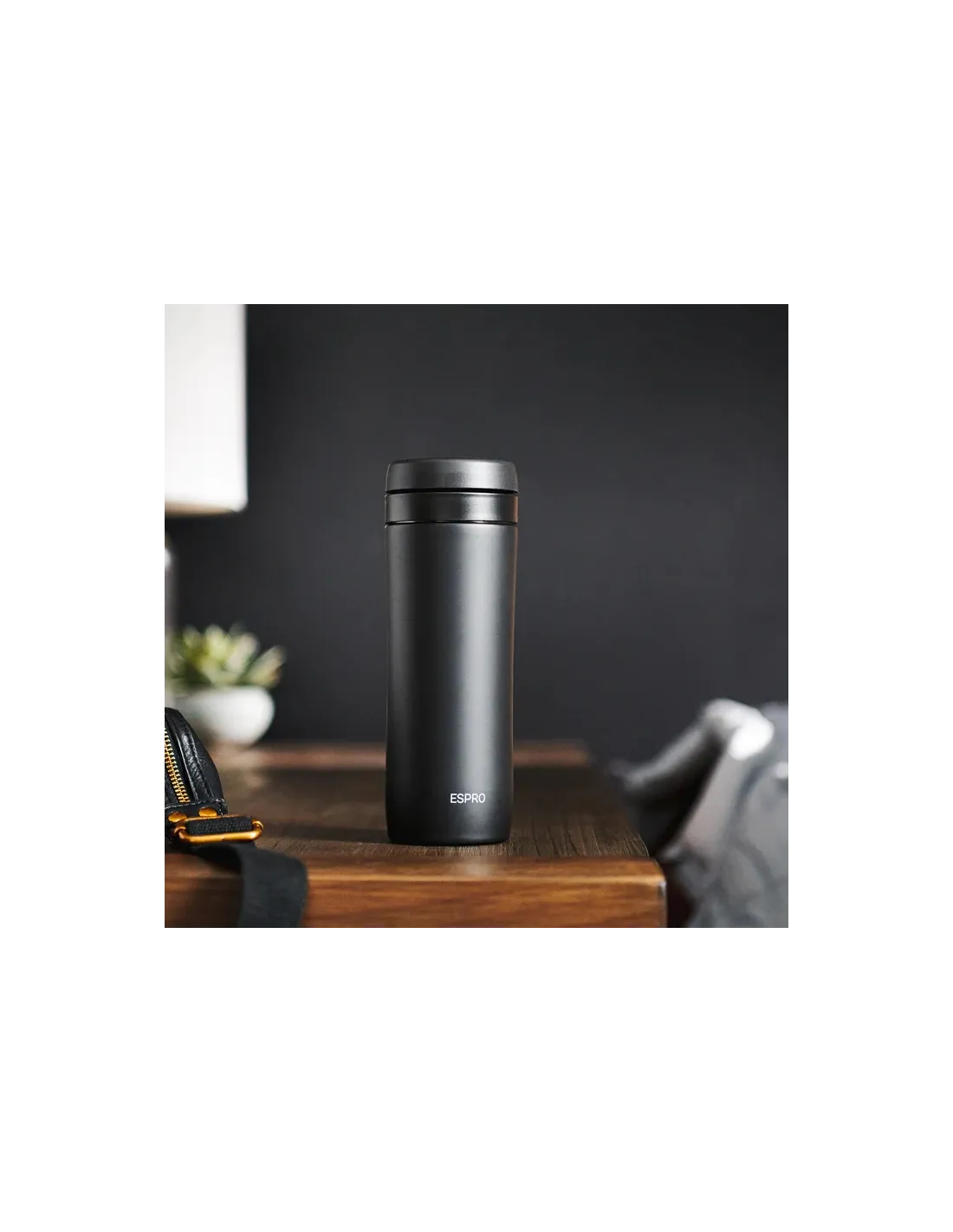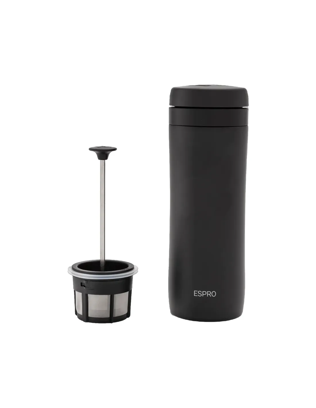 Presă de călătorie Espro din oțel inoxidabil, cu perete dublu, pentru a face cafea frenchpress oriunde în deplasare. Microfiltrul dublu patentat asigură o aromă bogată fără zaț de cafea. Termosul de 450 ml în sine.